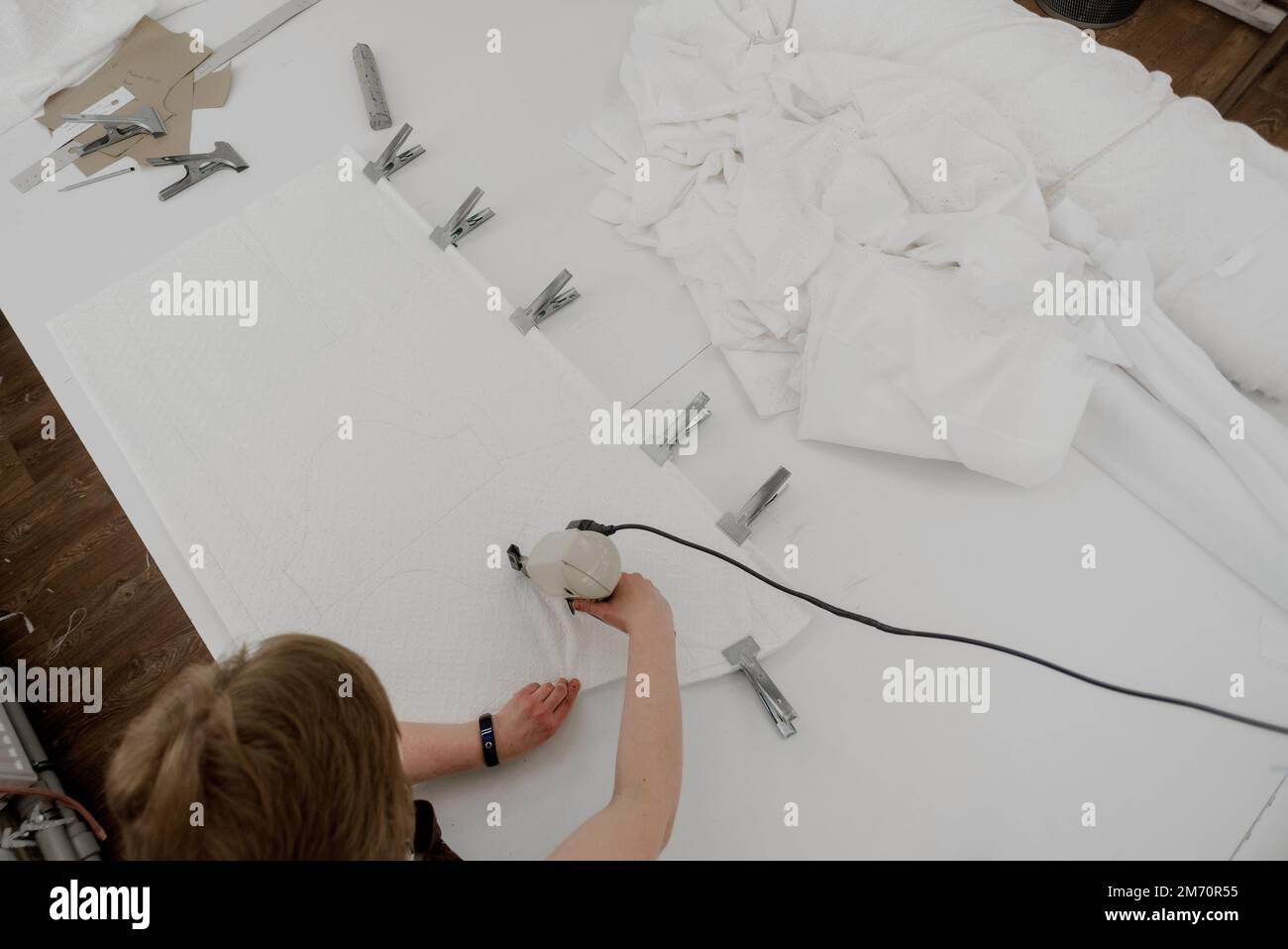 Producción de ropa de verano de mujer; proceso de fabricación en una fábrica de la industria ligera Fotografía de stock - Alamy