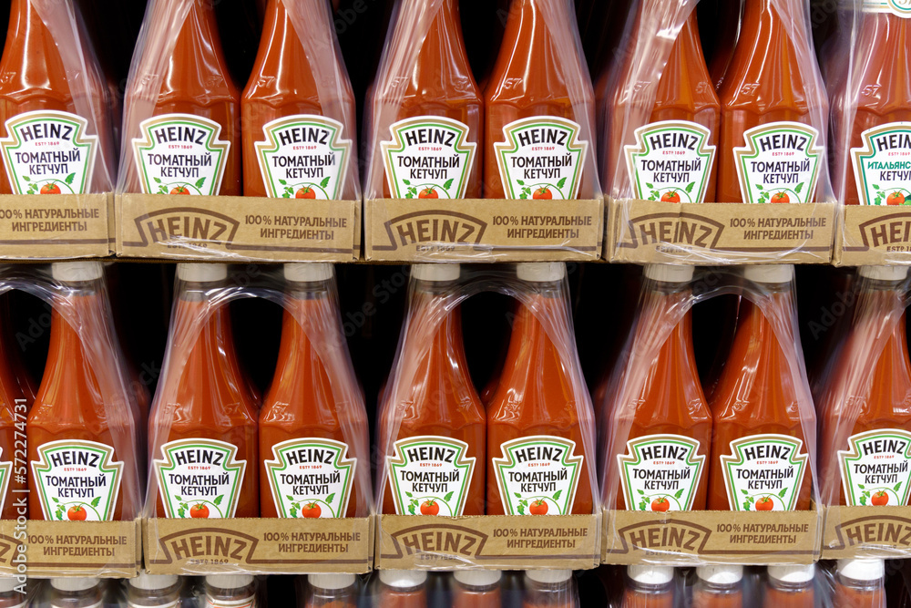 Tyumen, Russia-January 26, 2023: Heinz tomato ketchup at the supermarket store. Manufactured by H.J. Heinz Company foto de Stock | Adobe Stock