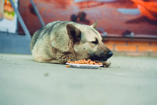 Perro callejero de comer carne cruda en la calle. Homeless perro come alimentos en la acera. Perro callejero fuera. Perro abandonado en busca de amor Fotografía de stock - Alamy
