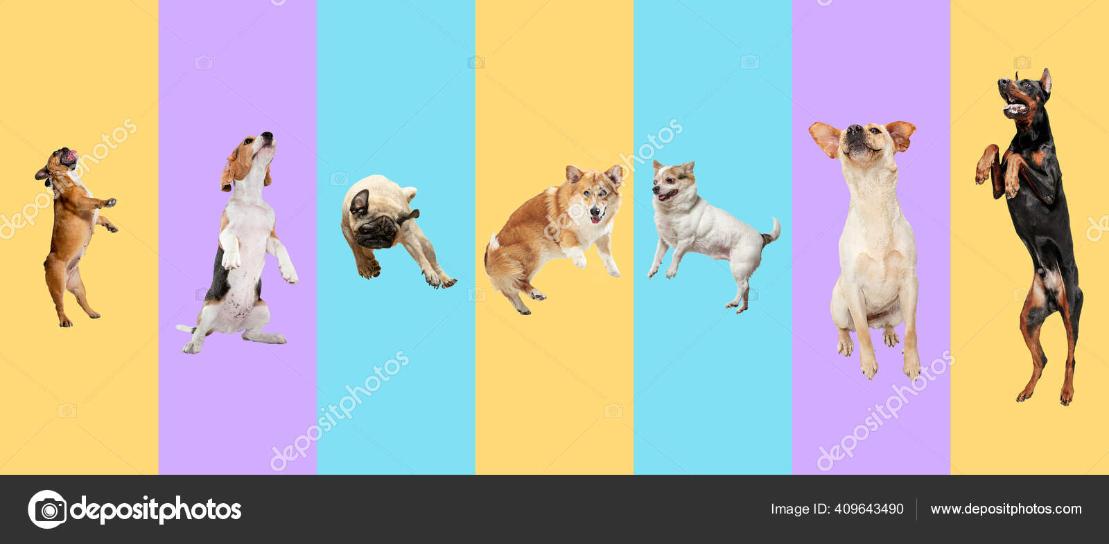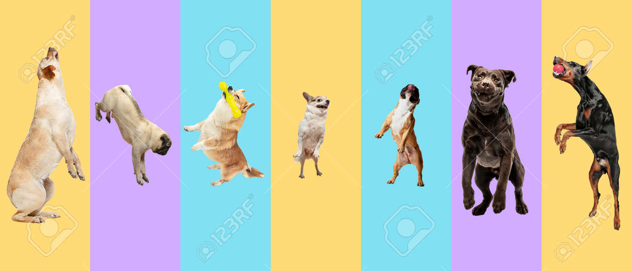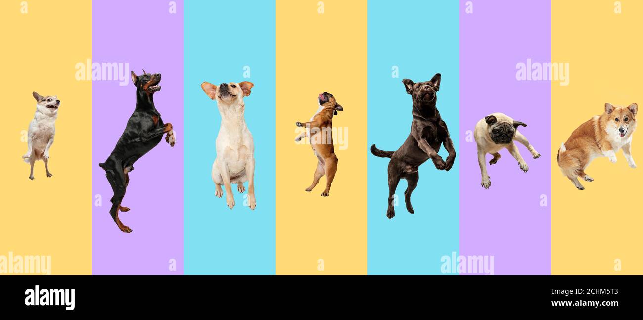 Collage de arte hecho de perros voladores divertidos diferentes razas saltando alto sobre fondo de estudio multicolor.: fotografía de stock © [email protected] #469509118 | Depositphotos