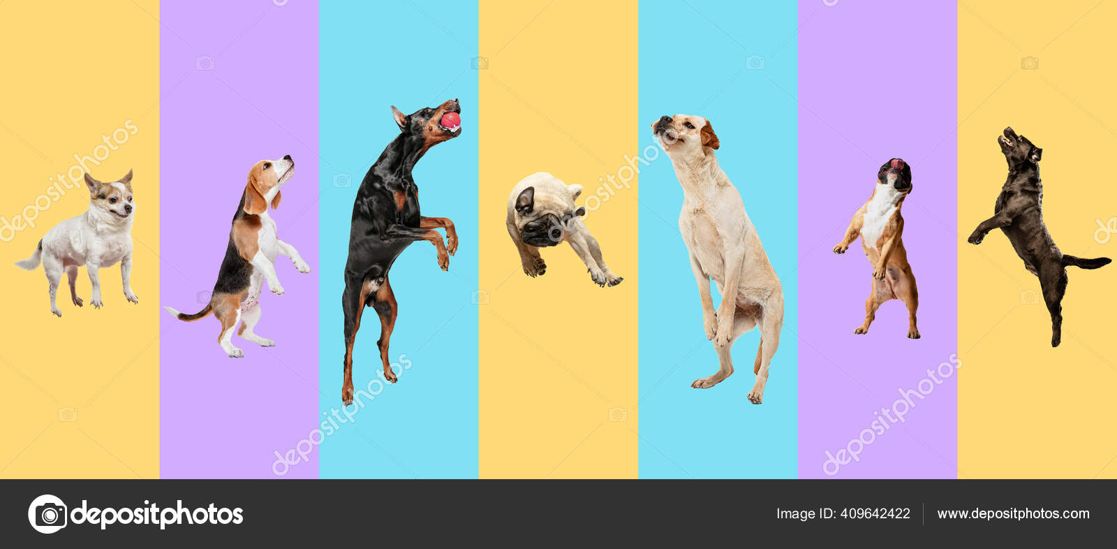 Collage creativo de diferentes razas de perros sobre fondo colorido: fotografía de stock © [email protected] #409642422 | Depositphotos