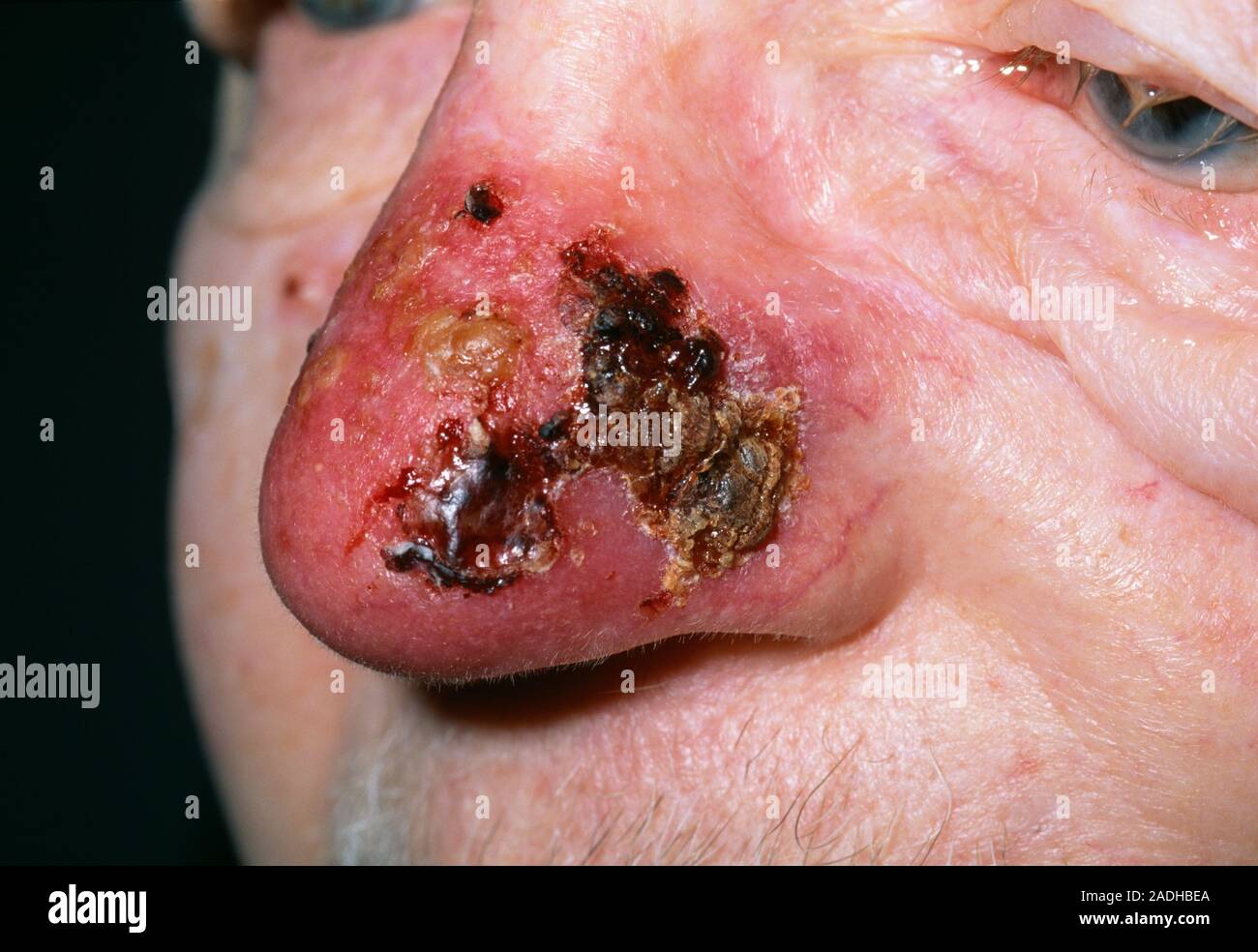 El cáncer de la piel después del tratamiento. La nariz de un hombre de 80 años, una semana después de la radioterapia. El tratamiento fue por un carcinoma de células basales (BCC)
