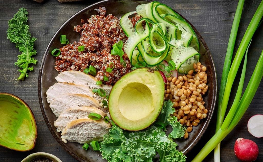 Ensalada de quinoa, pollo, aguacate y lentejas