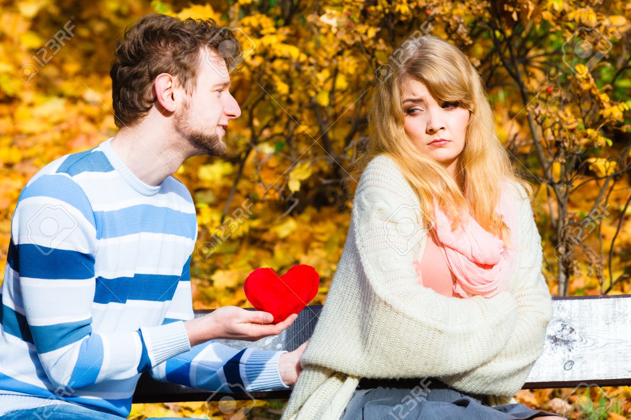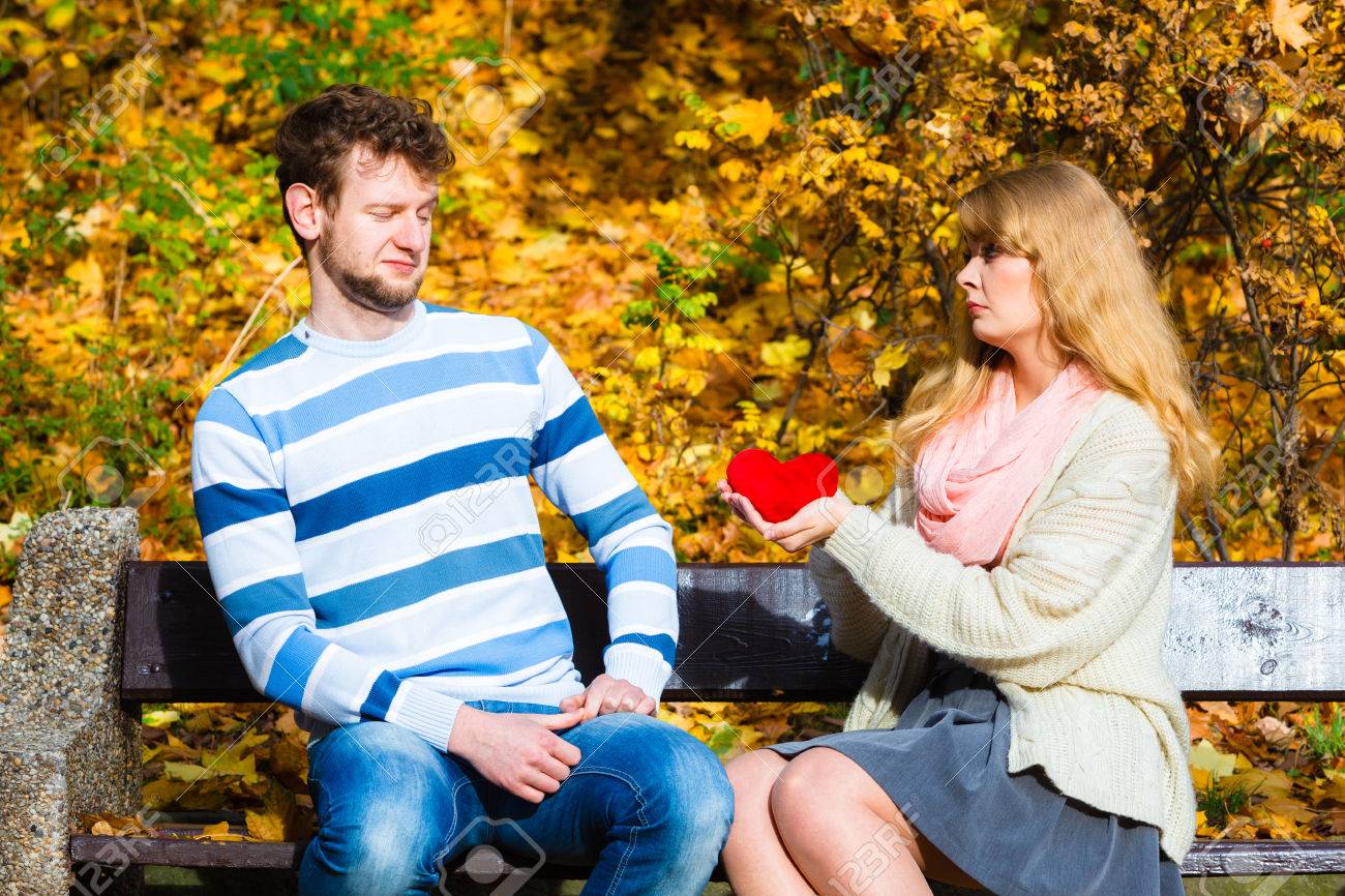 Confesando El Amor Y El Afecto Con Gesto Romántico. El Rechazo Y La Desaprobación. Reacción Negativa. Par Sentarse En El Banco En Parque Mujer De Sostener Corazón De Peluche Que Muestra Su