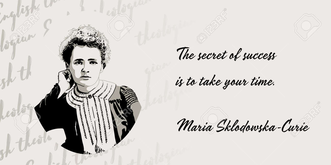 Vector. Retrato De Marie Skå'odowska-curie. - Científica Polaca Y Francesa, Educadora, Activista Social, Es La Primera Mujer Ganadora Del Premio Nobel. Y Su Frase "el Secreto Del Éxito Es Tomarse Su Tiempo".