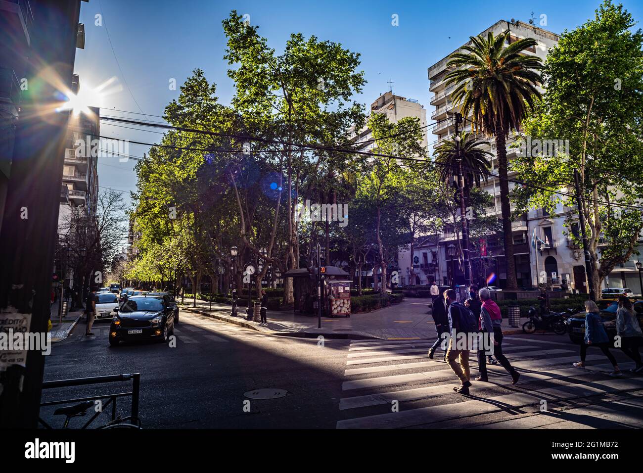 ROSARIO, ARGENTINA - Oct 06, 2020: General shot in front of the Pringles square in the city of Rosario with palm trees and people crossing the street Stock Photo - Alamy