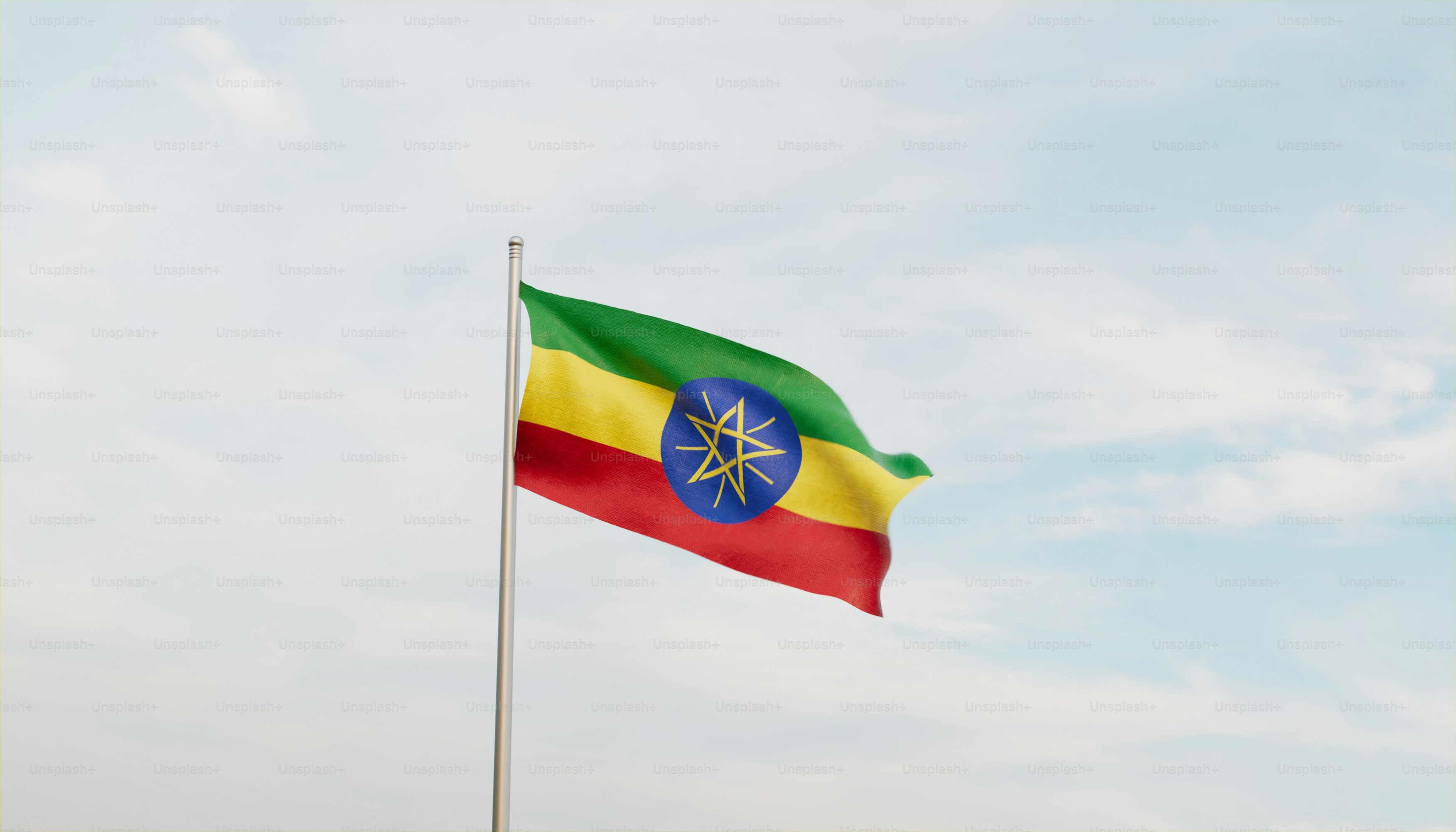 Flag of Rwanda blowing in the wind in front of a blue sky