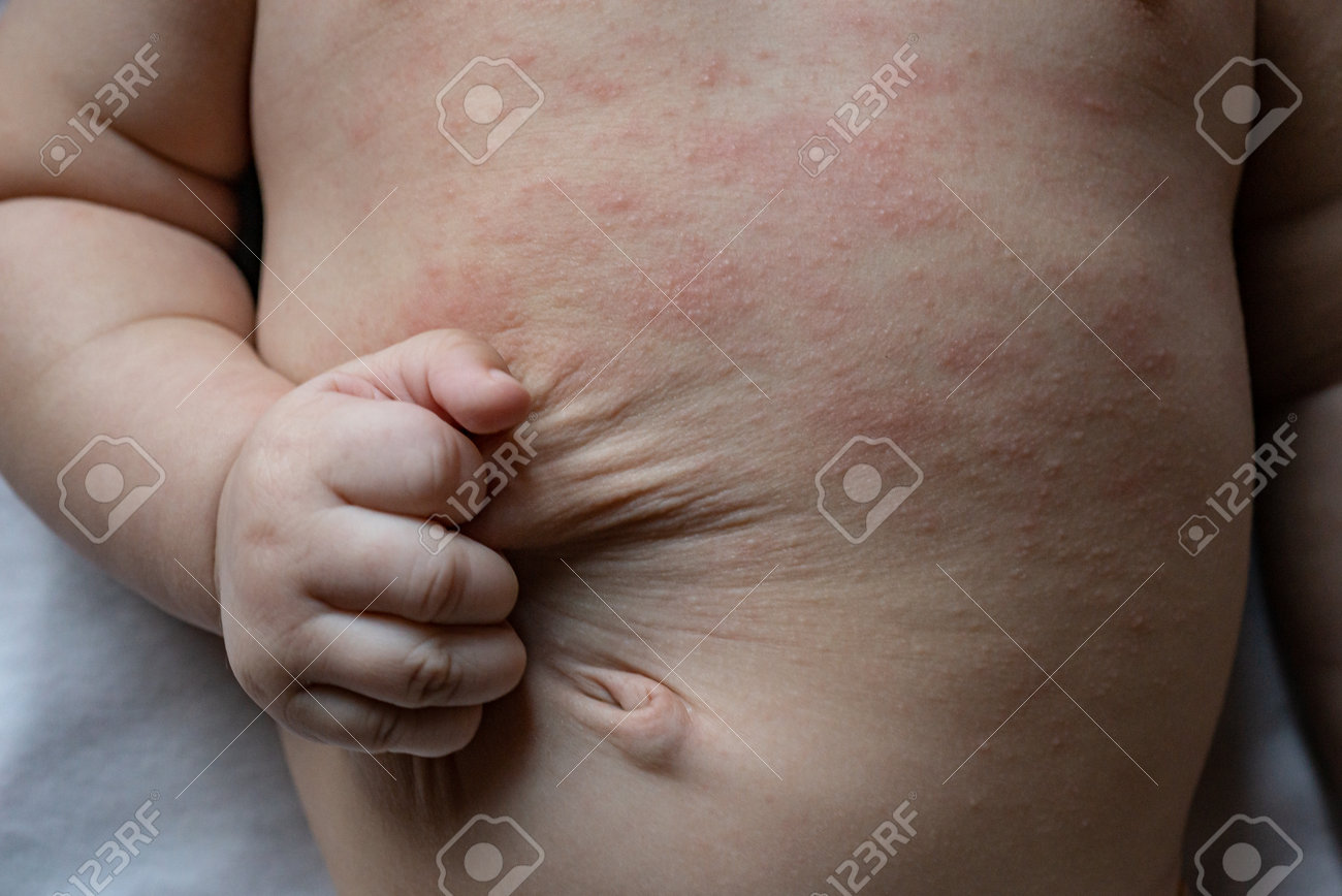 El Bebé Está Experimentando Una Erupción Roja Que Pica En El Pecho Y El Abdomen. La Erupción Aparece Como Parches De Piel Inflamada E Irritada Que Pueden Ir Acompañadas De Picazón Intensa.