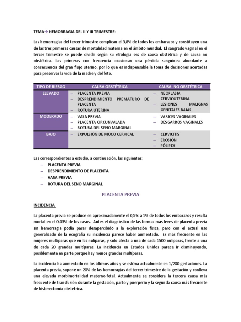 Tema 16. Hemorragia Del II y III Trimestre (Placenta Previa, Desprendimiento de Placenta, Vasa Previa, Ruptura Del Seno Marginal) | PDF | Parto | Placenta