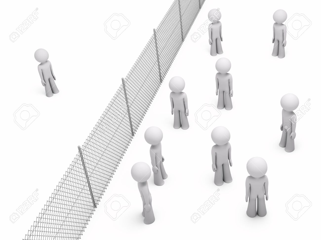 Hombre Separado De Un Grupo De Personas Por Una Valla De Malla De Alambre; Representación 3d Fotos, retratos, imágenes y fotografía de archivo libres de derecho. Image 6988271