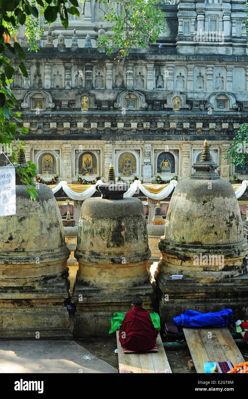La India estado de Bihar Bodh Gaya, catalogado como Patrimonio Mundial por la UNESCO Templo Mahabodhi complejo (Gran Despertar Templo) templo budista donde Siddhartha Gautama Buda alcanzó la iluminación joven monje orando