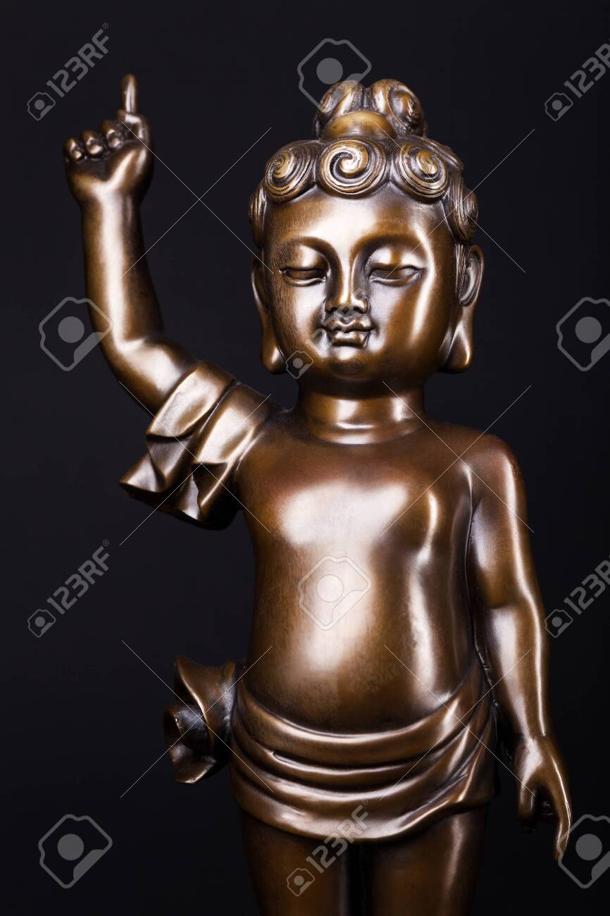 El Joven Príncipe Siddhartha Gautama Con Un Dedo Levantado. La Figura De Metal Aislada Sobre Fondo Negro. Fotos, retratos, imágenes y fotografía de archivo libres de derecho. Image 135847948