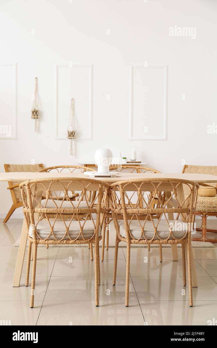 Wooden table with wicker chairs in interior of light dining room Stock Photo - Alamy