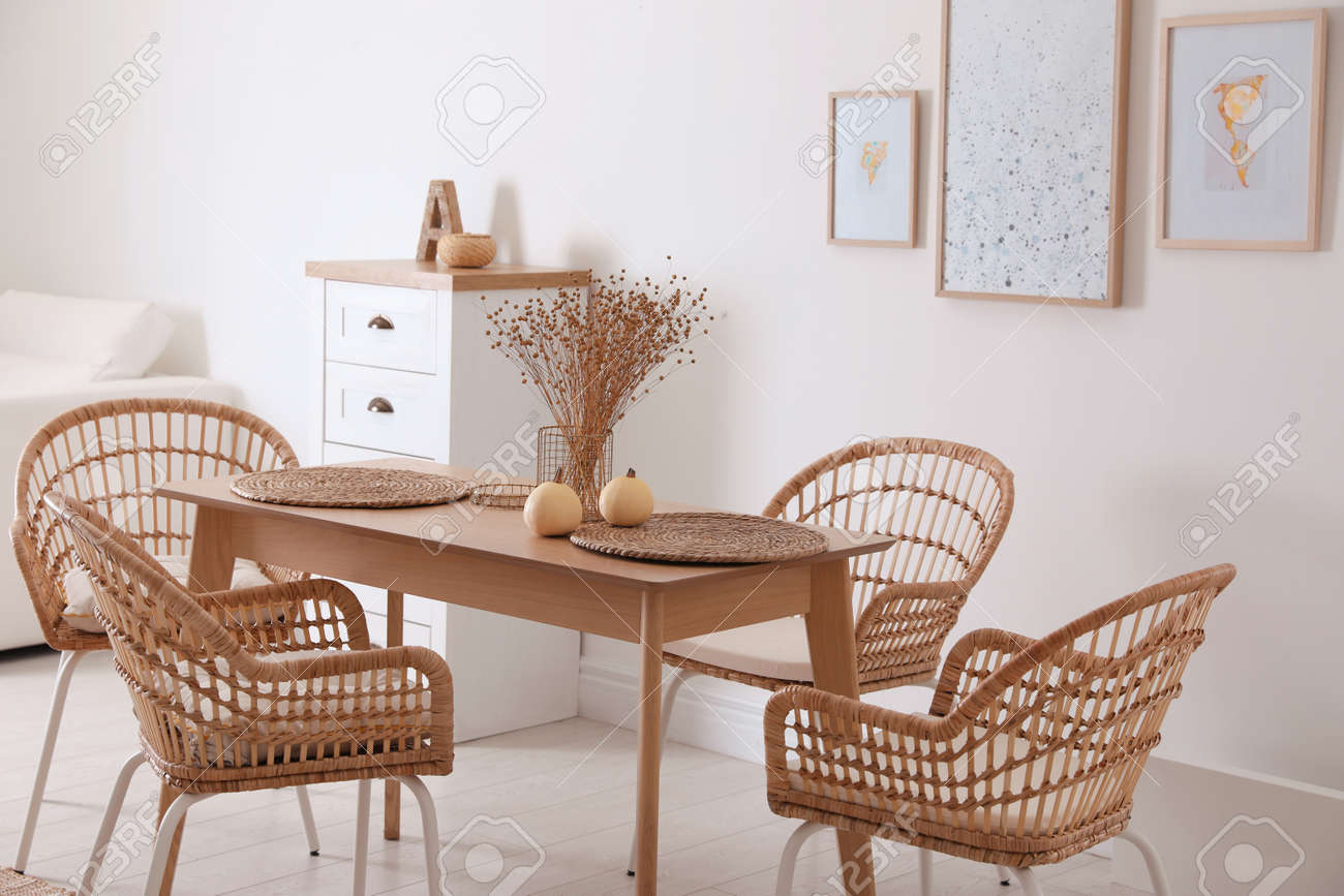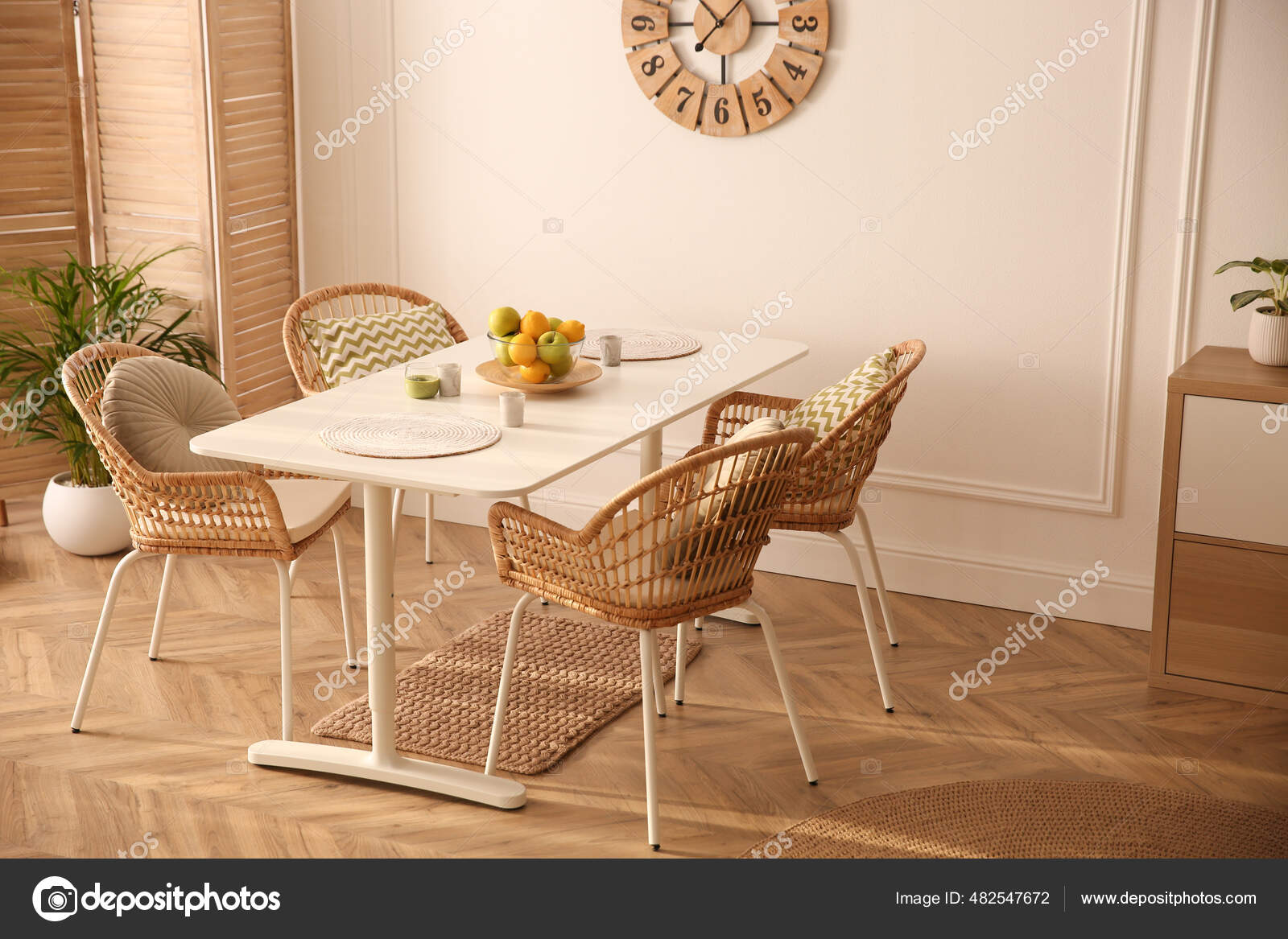 Elegante Mesa De Comedor Blanco Y Sillas De Mimbre En La Habitación. Interior Imagen de archivo - Imagen de apartamento, acogedor: 221281181