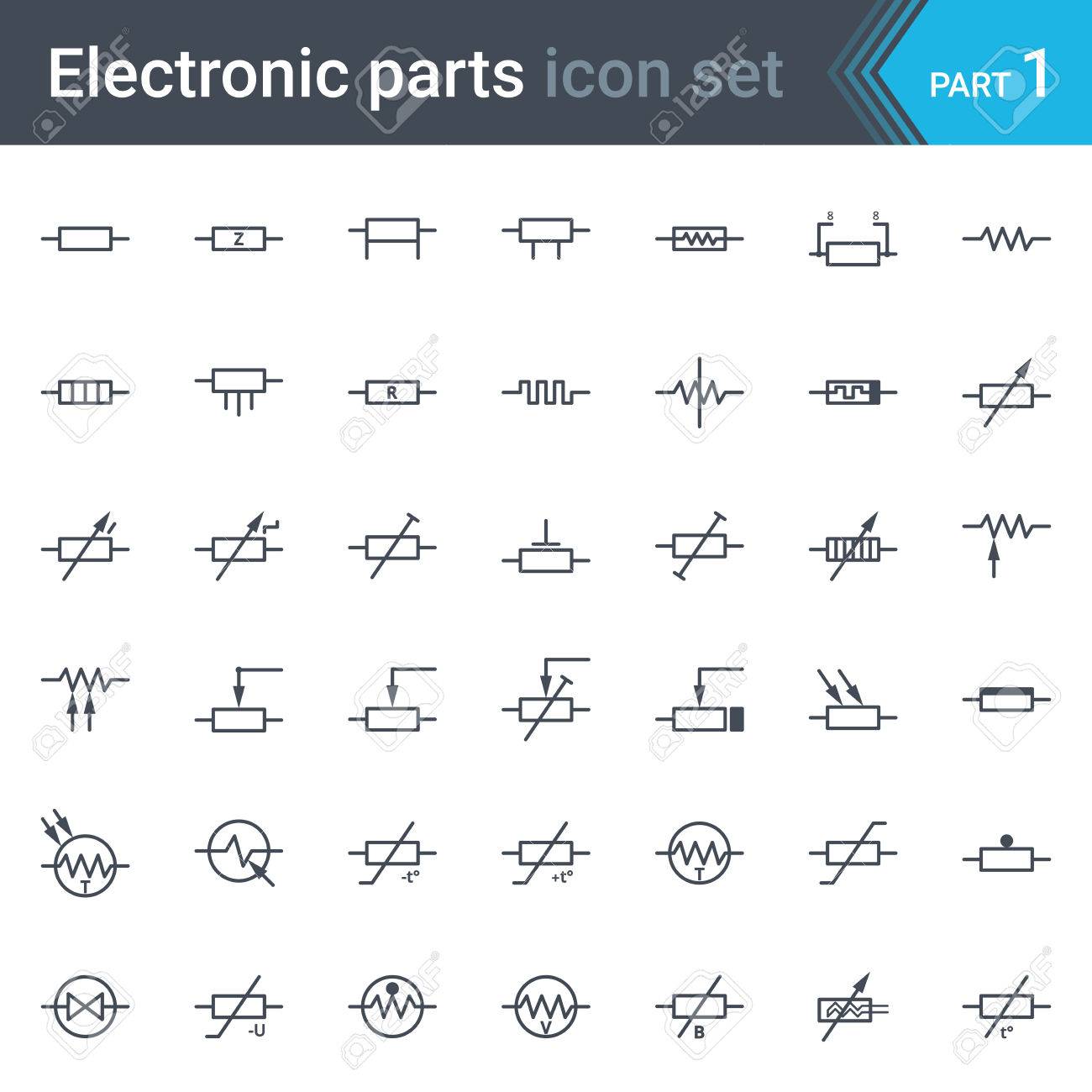 Juego Completo De Circuitos Eléctricos Y Electrónicos Símbolos Y Elementos - Resistencias Ilustraciones svg, vectoriales, clip art vectorizado libre de derechos. Image 86099384