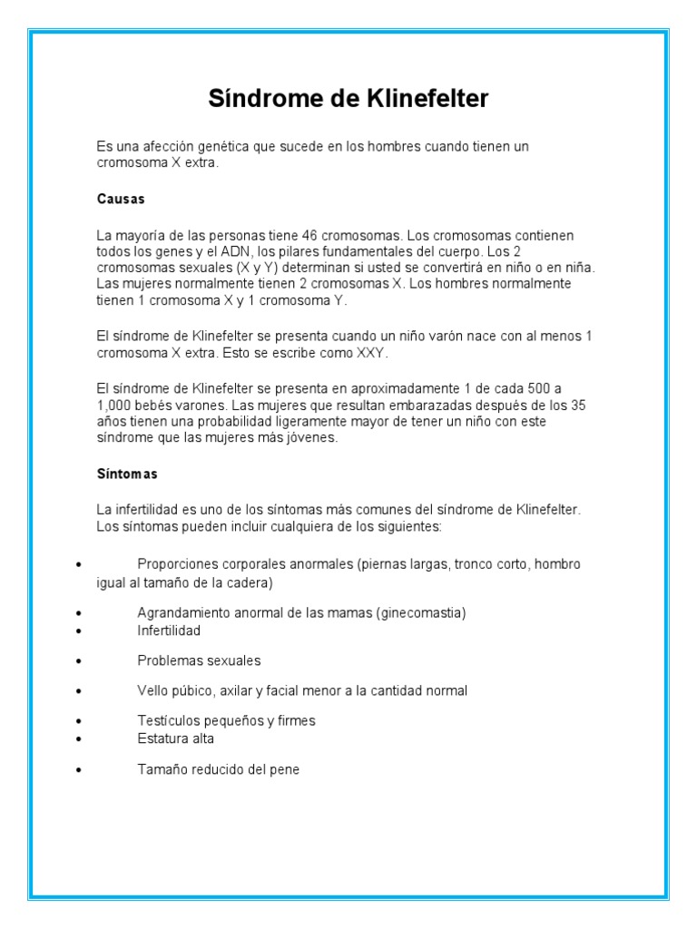 Consultorio Médico Dr. Mario A Carrillo - EL SÍNDROME DE KLINEFELTER: GUÍA PARA LAS FAMILIAS ¿De qué se trata el síndrome de Klinefelter? Es una afección en los varones causada por la