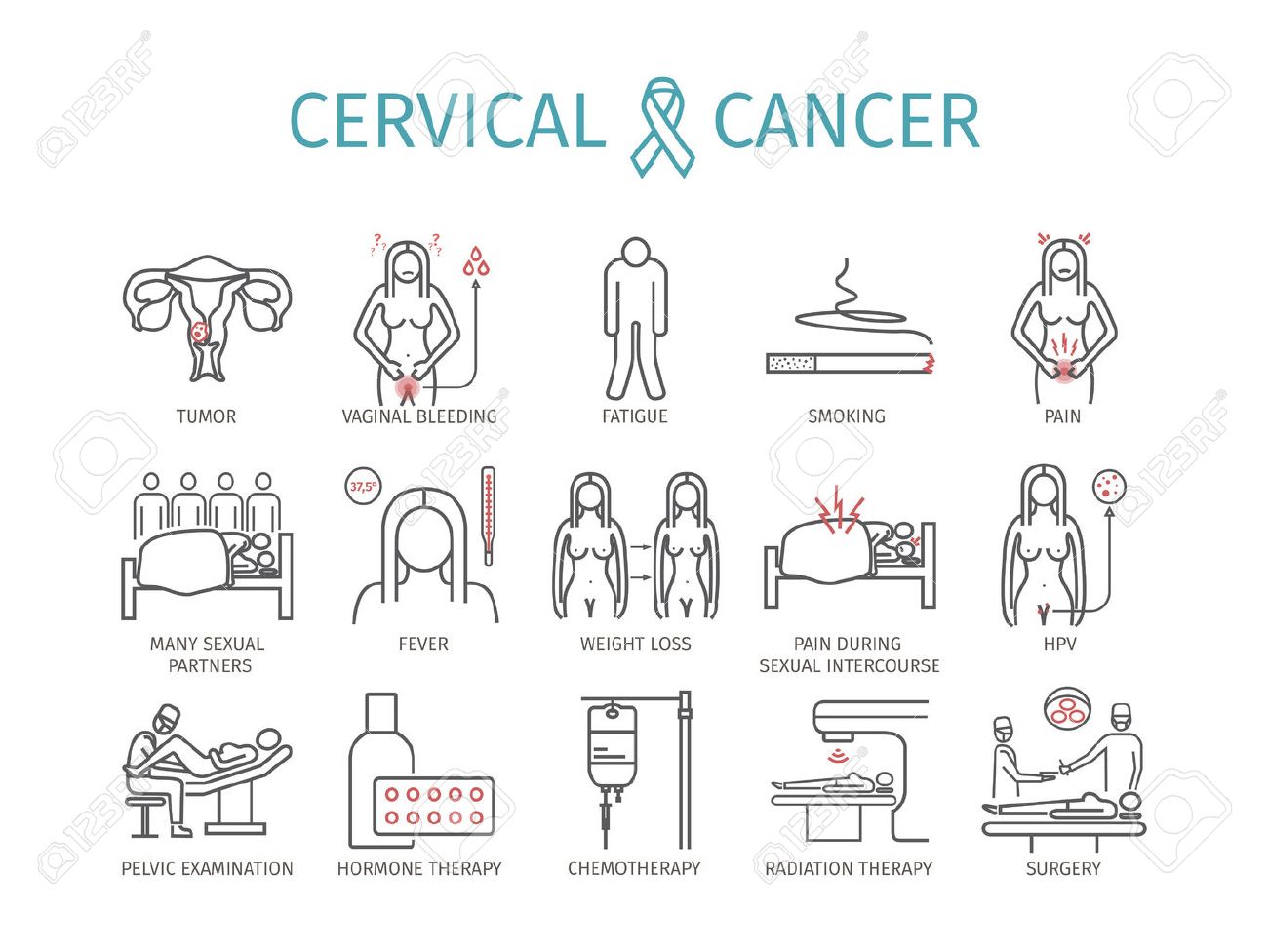 Cáncer De Cuello Uterino. Síntomas, Causas, Tratamiento. Iconos De Línea Establecidos. Vector Signos Ilustraciones svg, vectoriales, clip art vectorizado libre de derechos. Image 77611822
