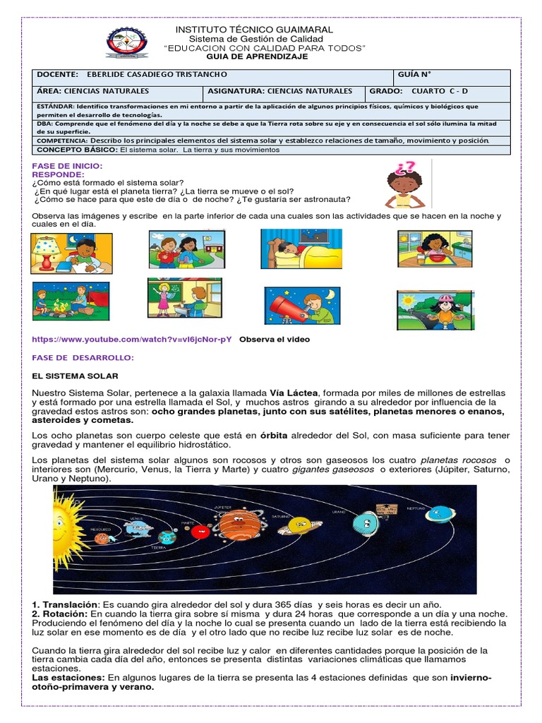 Guia de Aprendizaje Sistema Solar y La Tierra Cuarto 01-04-20 ...