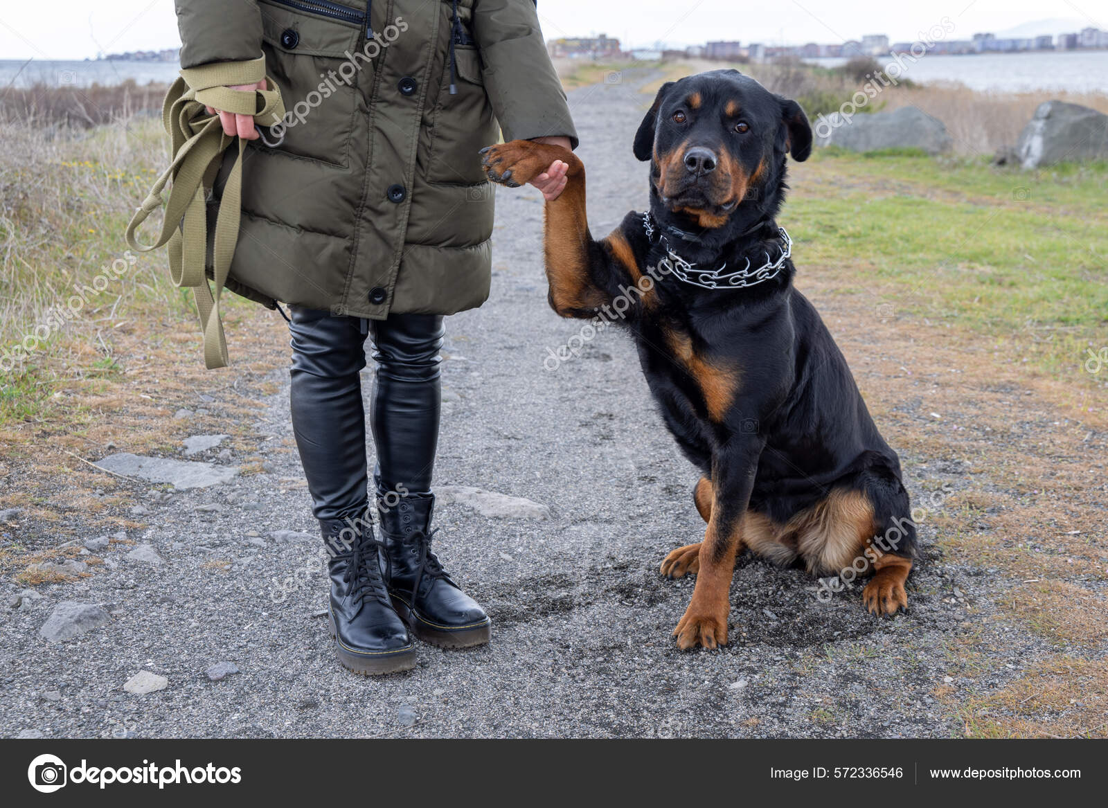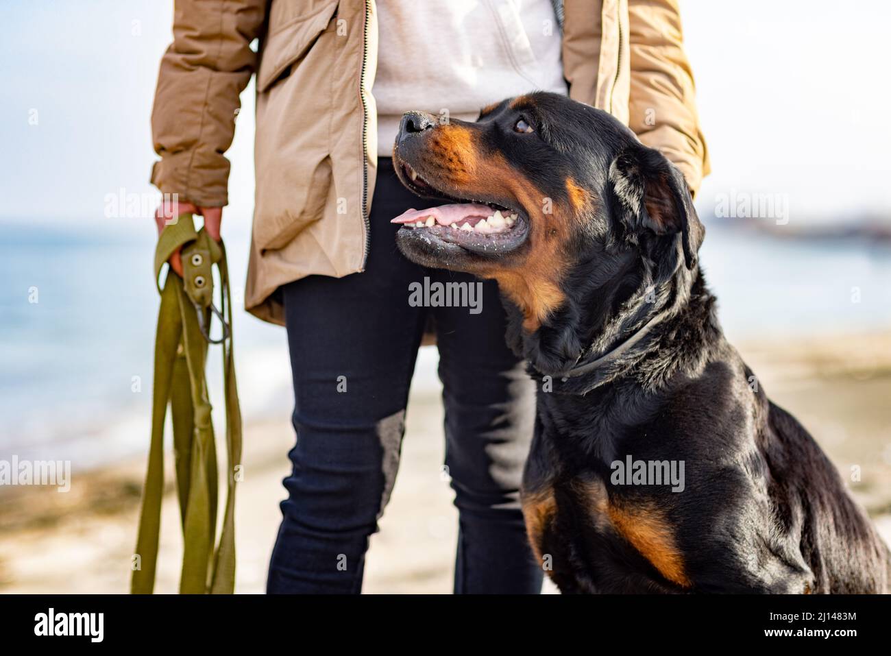 Un perro fiel grande y hermoso de la raza Rottweiler se sienta cerca de su propietario en una chaqueta cálida beige, en una playa arenosa con el telón de fondo de un