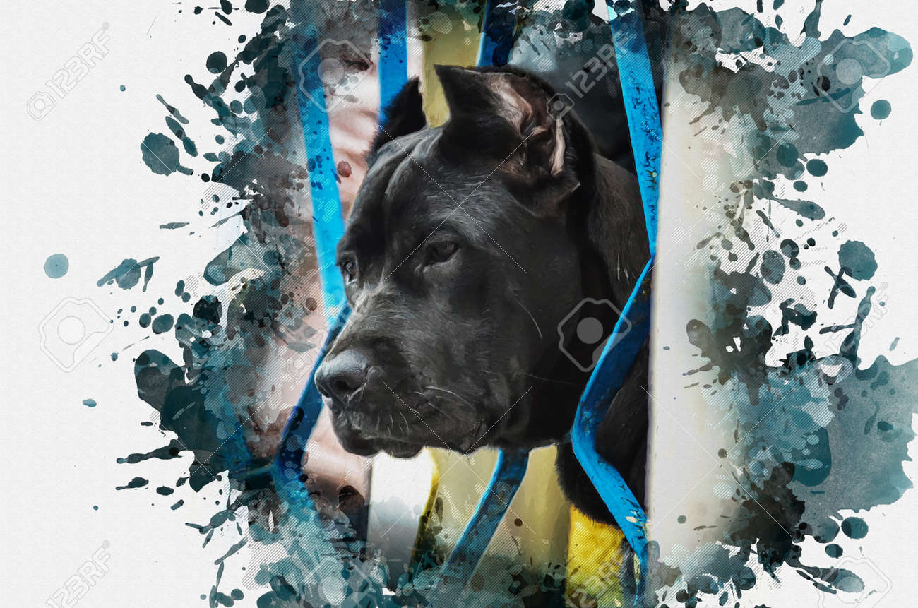 Pintura Digital En Acuarela De La Raza Canina Italiana Cane Corso. Retrato De Un Perro Negro Más Grande Con Orejas Recortadas. La Mascota Adulta Asoma La Cabeza A Través De Los Barrotes