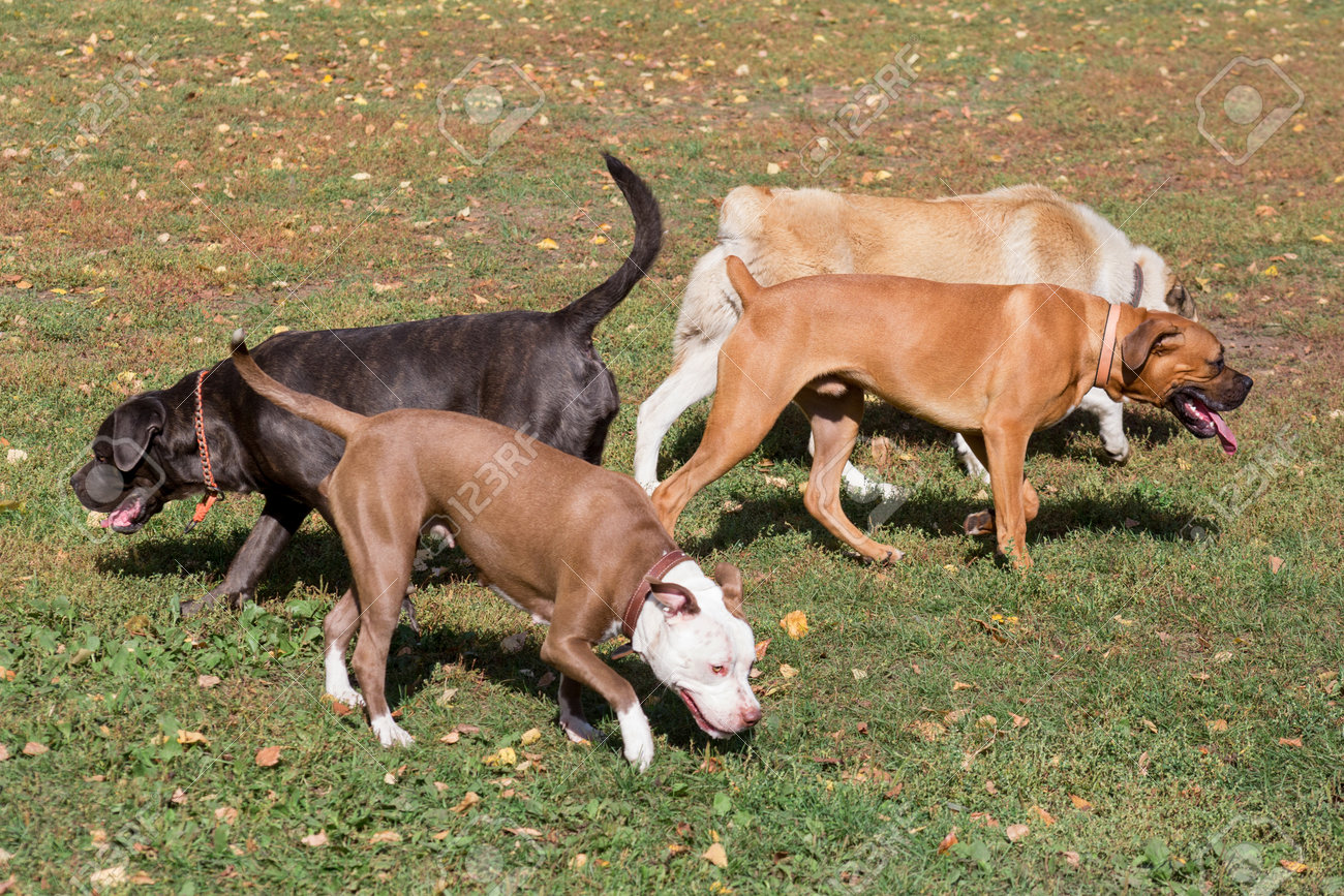 Cachorro De Cane Corso, Cachorro De Boxeador Alemán, Cachorro De Alabai Y Cachorro De Pit Bull Terrier Americano Están Caminando Sobre Una Hierba Verde En El Parque De Otoño. Mascotas. Perro De