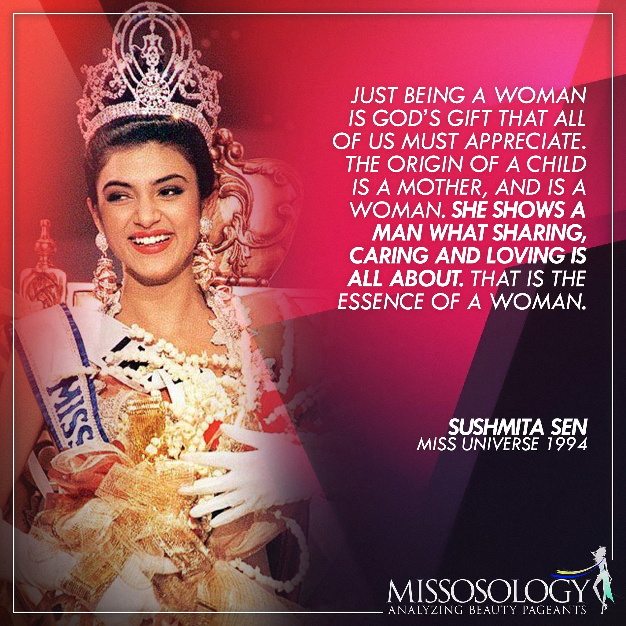 Missosology on X: "In Miss Universe 1994, Miss India Sushmita Sen was asked, "What is the essence of being a woman?" #MissUniverse #MissosologyBig5 #IWD2018 #InternationalWomensDay https://t.co/OIk5vhF2Dn" / X