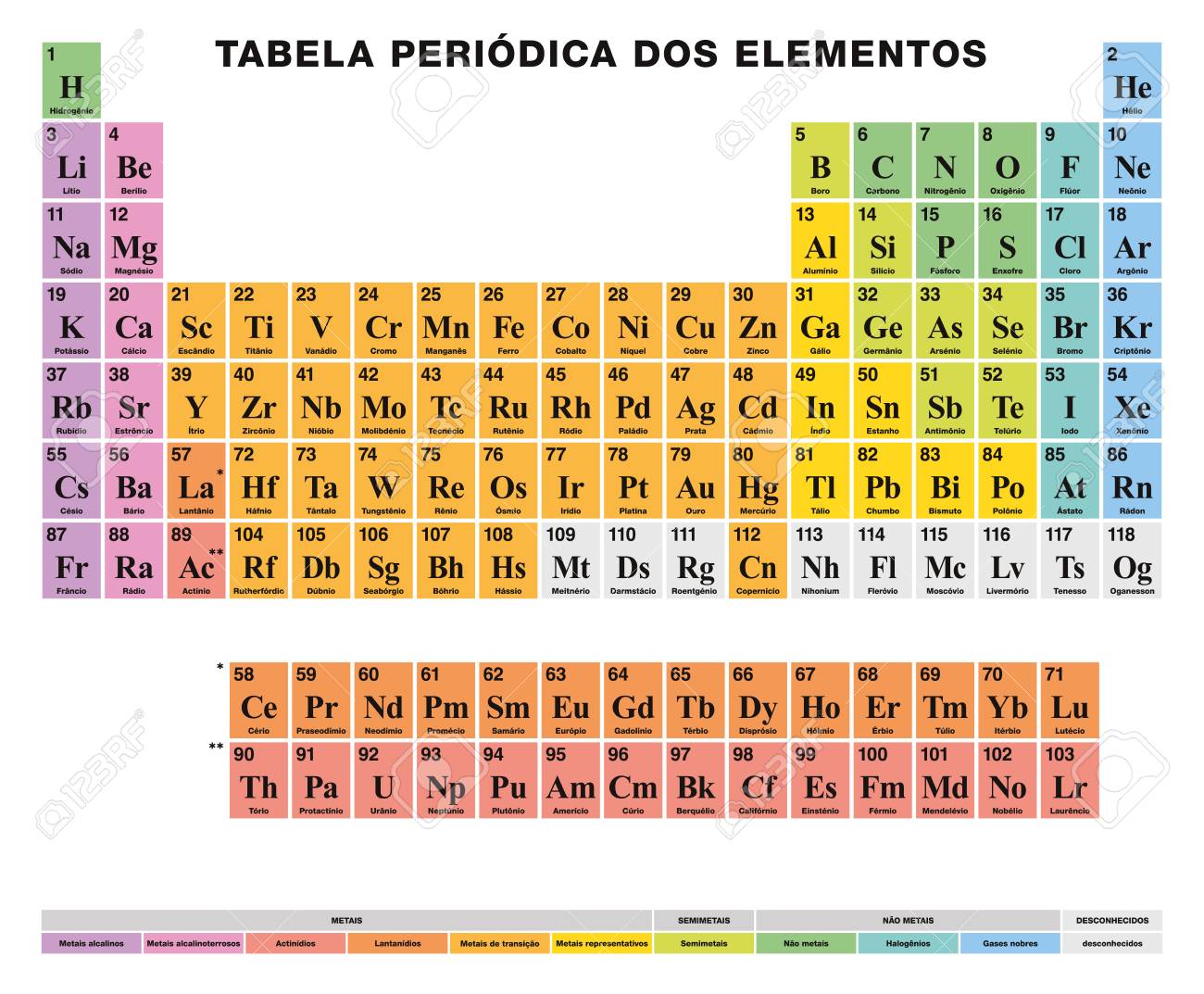 Tabla Periódica De Los Elementos. Etiquetado PORTUGUÉS. Disposición Tabular 118 Elementos Químicos. Números Atómicos, Símbolos, Nombres Y Celdas De Color Para Metal, Metaloide Y No Metal. Ilustración. Vector. Ilustraciones svg, vectoriales, clip