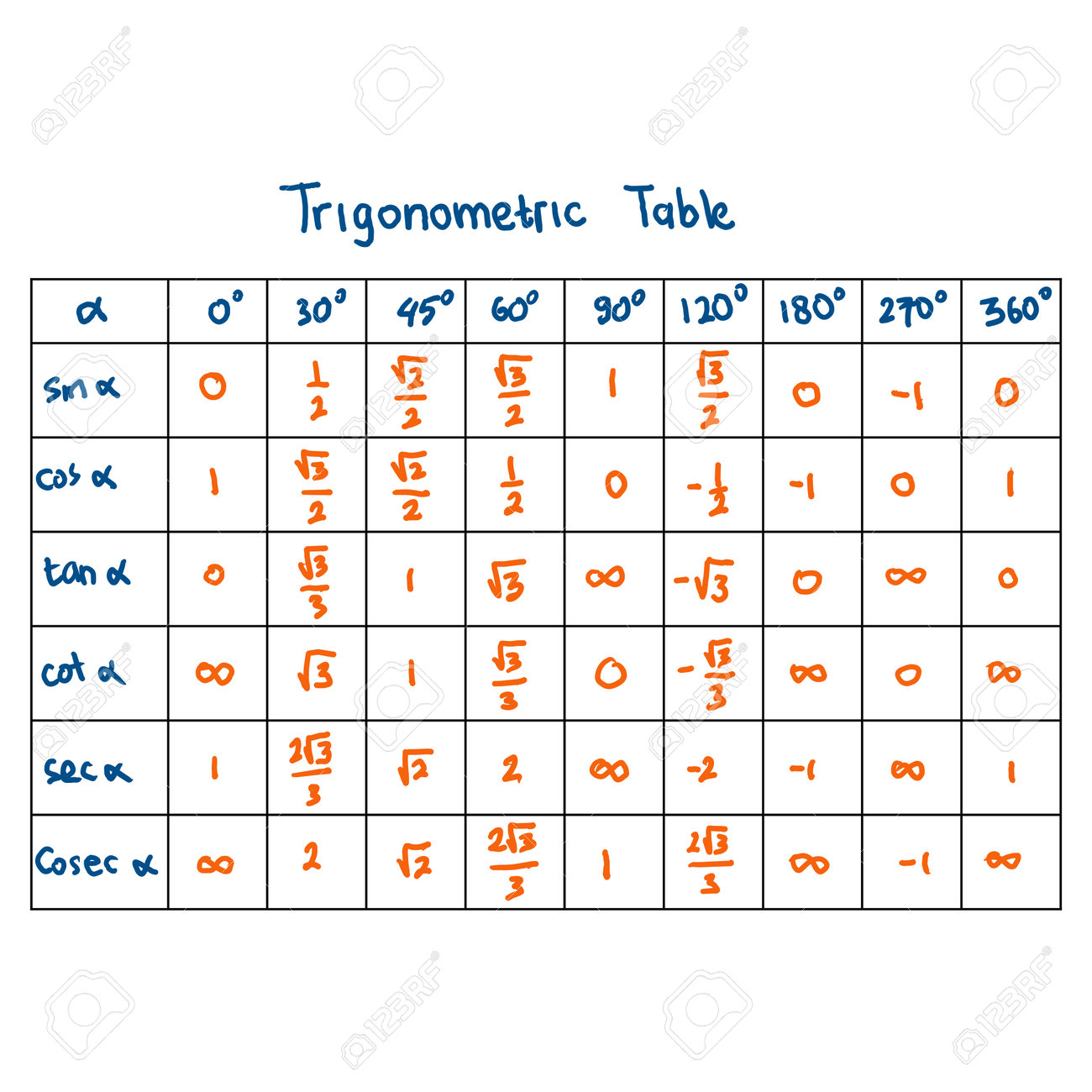 Tabla Trigonométrica. Una Tabla Que Describe Los Valores De Seno, Coseno, Tan, Seg, Cosec Y Cotan En Ángulos Especiales. Matemáticas De Primer Nivel. Tabla Matematica Editable Ilustraciones svg, vectoriales, clip art vectorizado