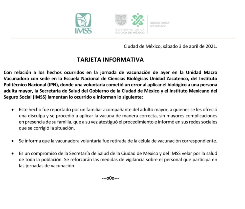 Secretaría de Salud de la Ciudad de México on X: "⚠️ TARJETA INFORMATIVA⚠️ Con relación a los hechos ocurridos en la jornada de vacunación de ayer en la Escuela Nacional de Ciencias