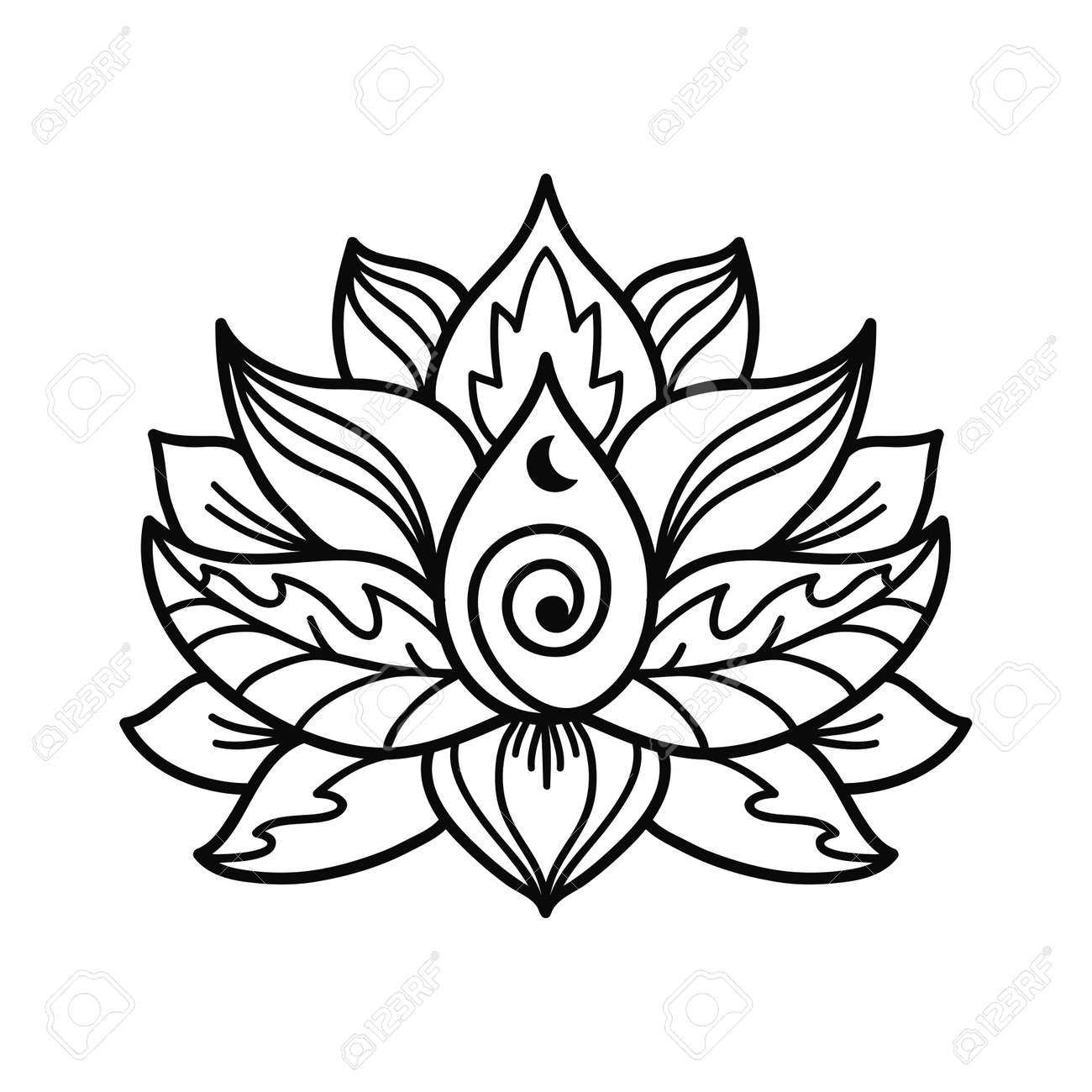 Ilustración de Elementos De Loto Místicos Plantilla De Tatuaje De Línea De Flores Espirituales Símbolos De Estilo Boho Diseño De Yoga De Henna De La India Arte Gráfico Vectorial Ordenado Mágico Celestial