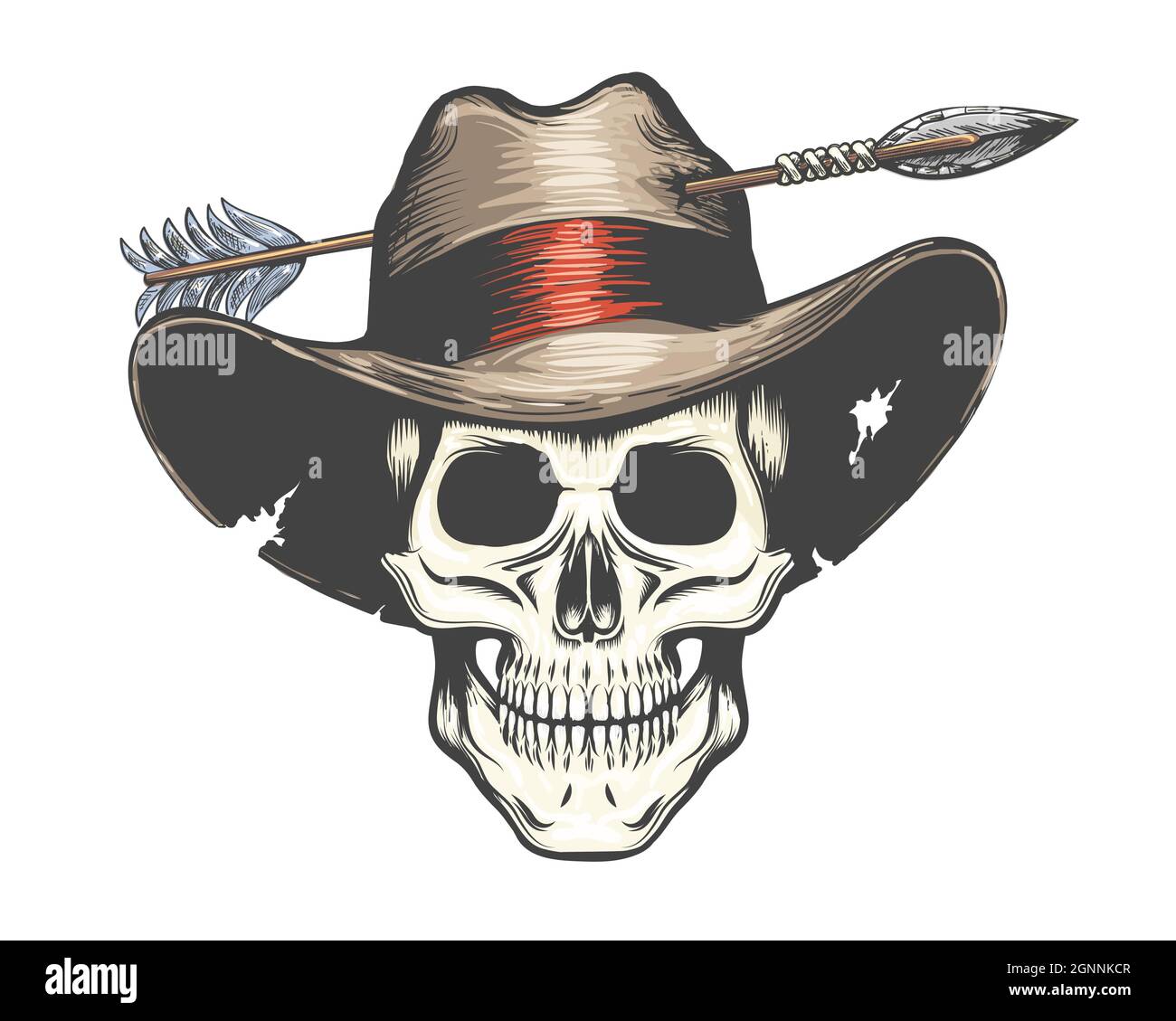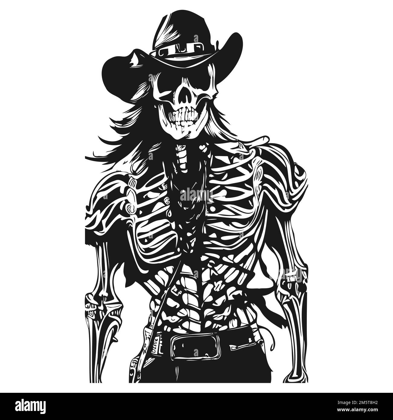 Outlaw vaquero cráneo tatuaje dibujado a mano vector blanco y negro imágenes prediseñadas | Vector Premium