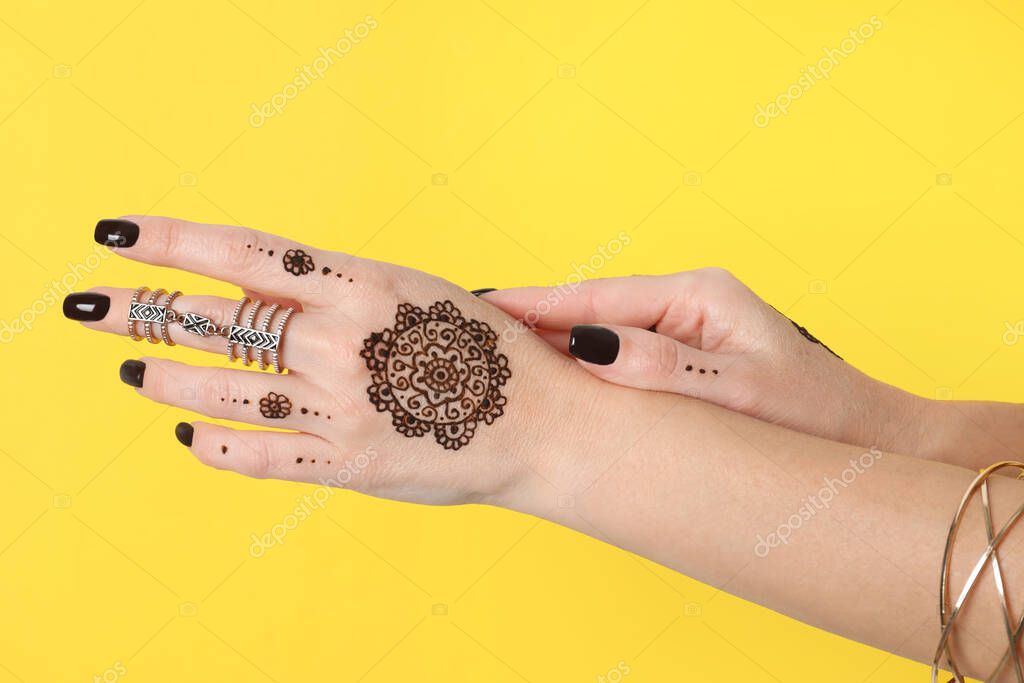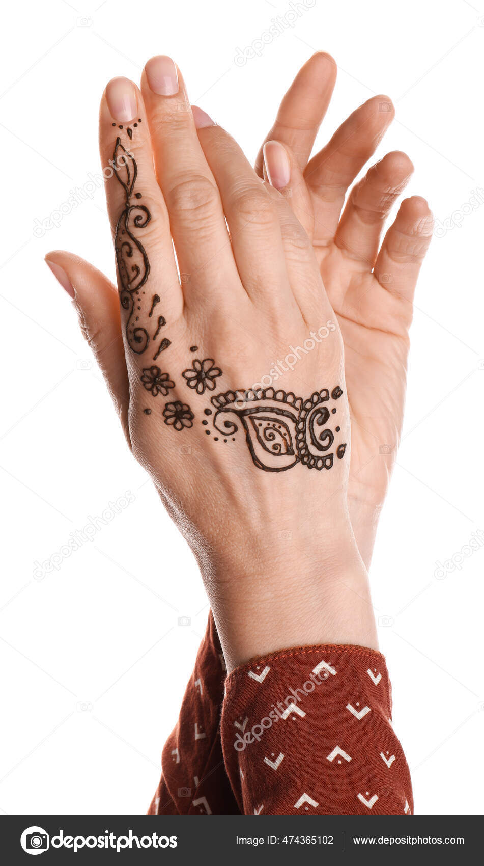 Mujer Con Tatuaje De Henna En La Mano Contra El Cierre Blanco. Ornamento Mehndi Tradicional Imagen de archivo - Imagen de hinduismo, piel: 227182127