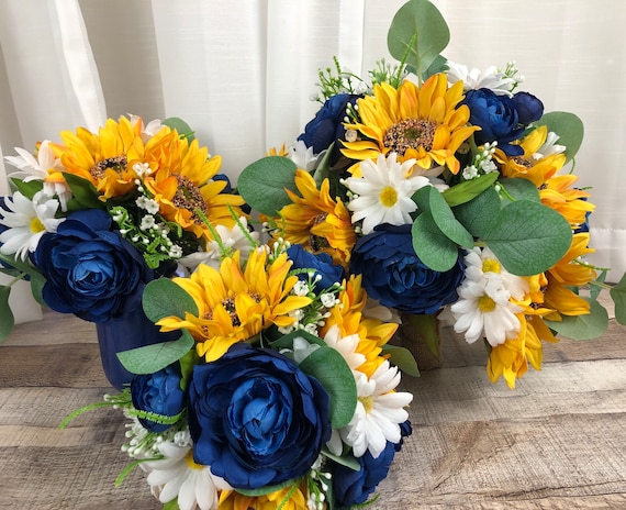 Flores de novia de girasol, girasol de margarita y flores de novia azul marino, ramos de boda artificiales, tema de boda de jardín de girasol - Etsy España