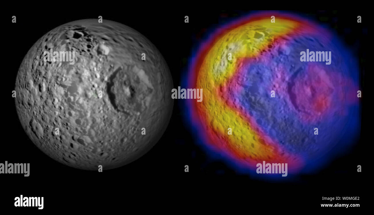 La alta resolución de temperatura aún Mapa y mostrar imágenes lunas heladas de Saturno, Mimas, obtenidas por la nave espacial Cassini de la NASA, revela patrones sorprendentes en la superficie de la