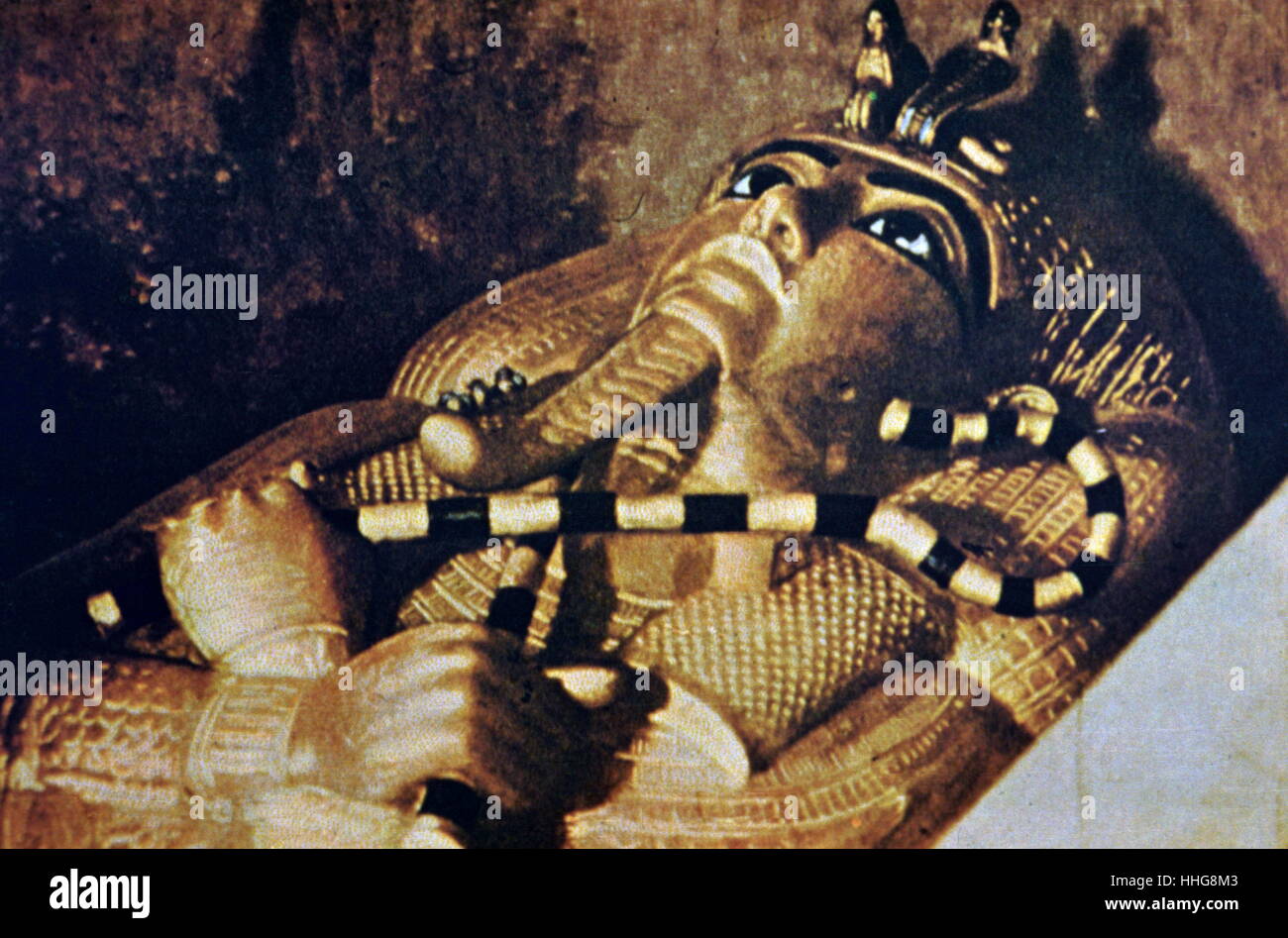 Tercer sarcófago de oro para la momia de Tutankamón, tesoros de la tumba de Tutankamón, descubierta en 1922. Tutankamón fue un faraón egipcio de la XVIII dinastía (gobernó c. 1332-1323 BC). Ahora