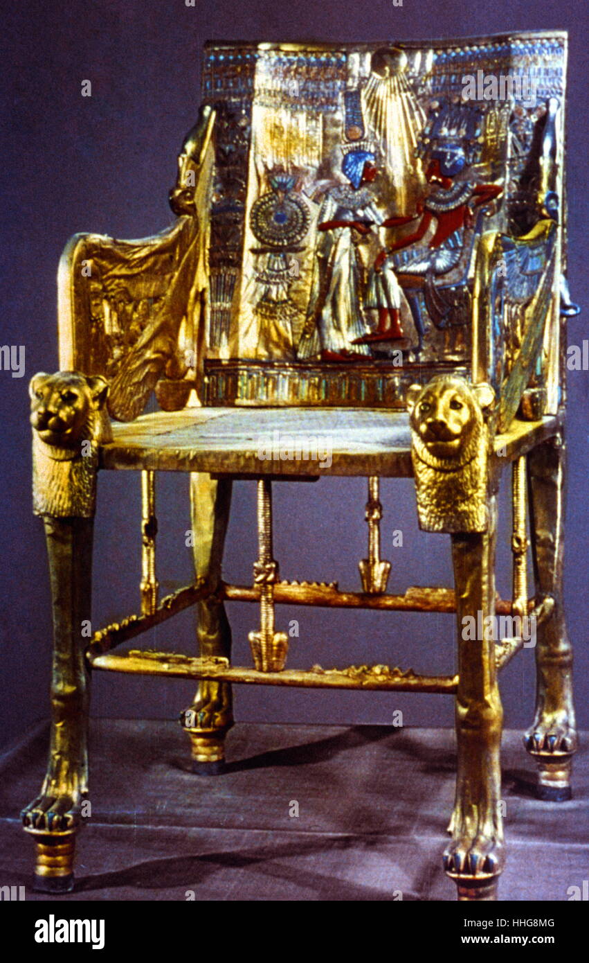El trono dorado del faraón Tutankamón, tesoros de la tumba de Tutankamón, descubierta en 1922. Tutankamón fue un faraón egipcio de la XVIII dinastía (gobernó c. 1332-1323 BC). Ahora se muestran en