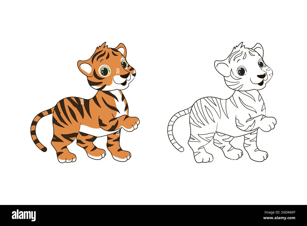 Página para colorear para niños, cachorro de tigre pequeño rayado. Ilustración vectorial en estilo de dibujos animados, línea de arte aislada Imagen Vector de stock - Alamy