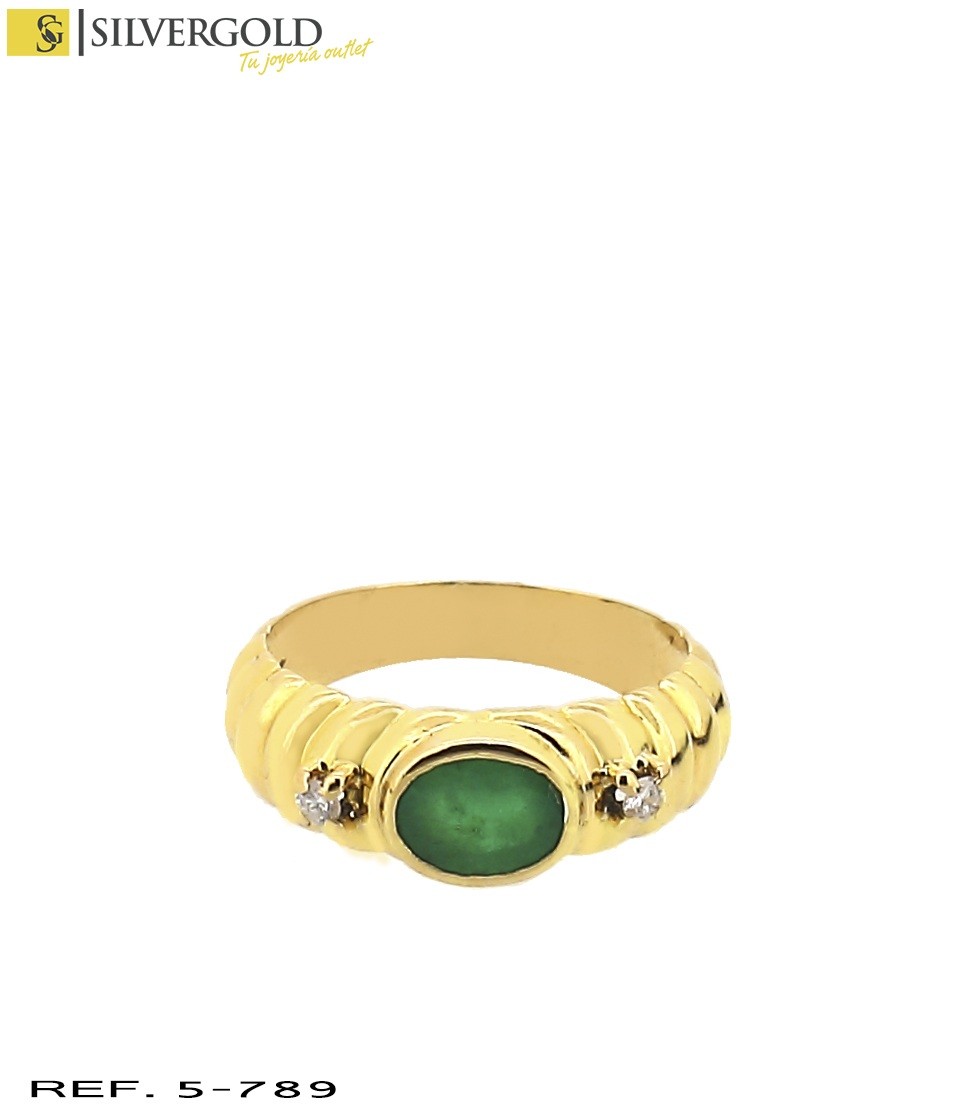 1-5-789 Anillo oro 18Kt. gallonado con piedra verde tipo esmeralda oval y dos diamantes T13 L5365