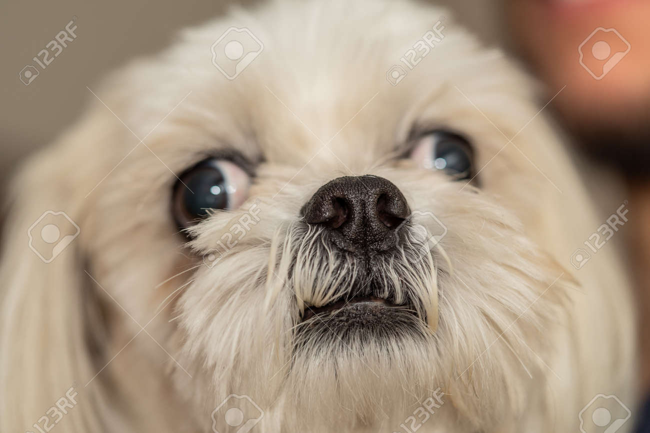 Perro Bizco Esponjoso. Aspecto Lindo. Primer Plano De La Nariz ...