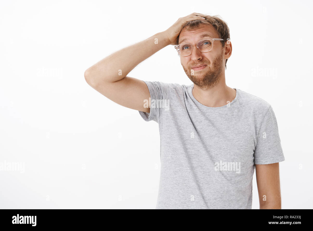 Cintura-up shot de tonto confundido padre adulto con cerdas de rascarse en los vasos de la cabeza y smirking entrecerrar contemplando izquierda lejos desorientado e interrogó a pie preocupado por pared gris