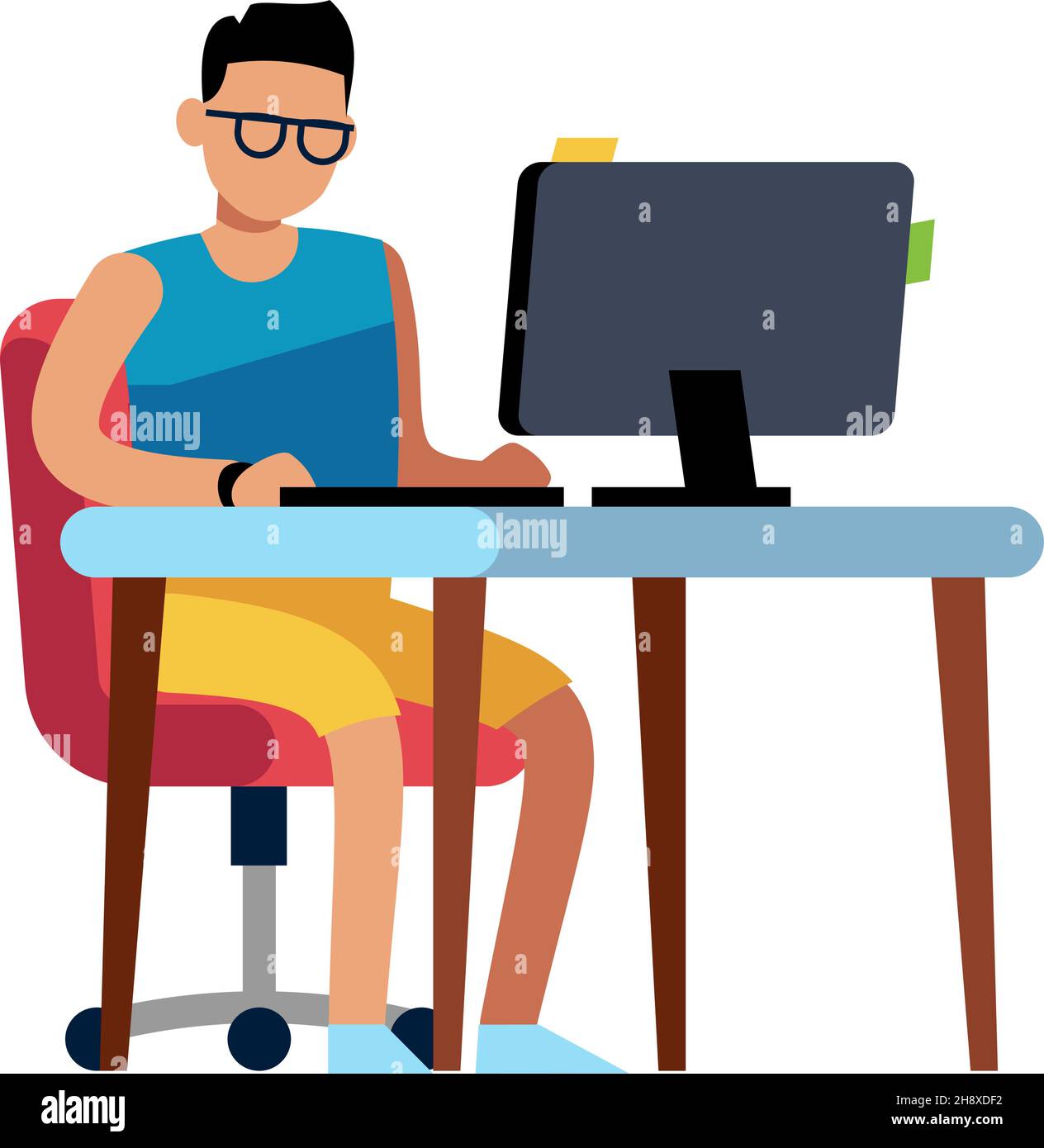 Hombre sentado en el escritorio. Hombre trabajando en la computadora. Icono de oficina remota Imagen Vector de stock - Alamy