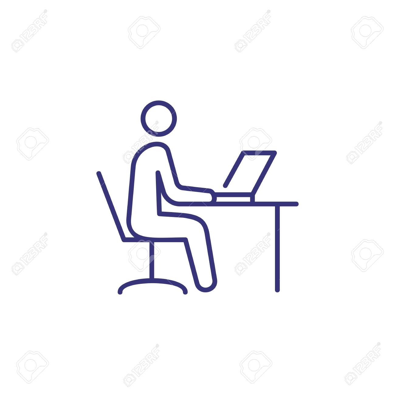 Trabajar En El Icono De Línea De Computadora. Hombre Sentado A La Mesa Y Usando La Computadora Portátil. Concepto De Lugar De Trabajo. Se Puede Utilizar Para Temas Como Trabajo De Oficina,
