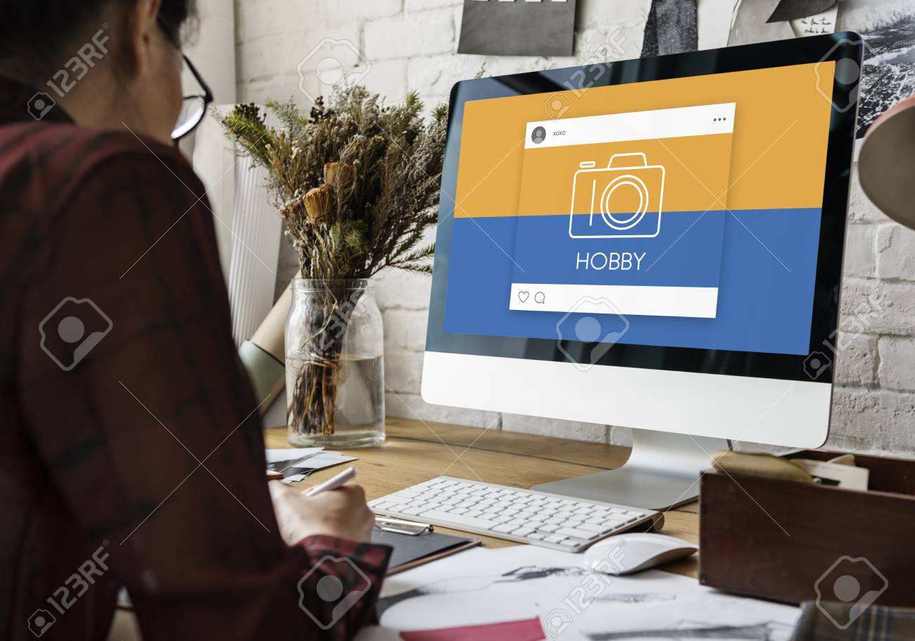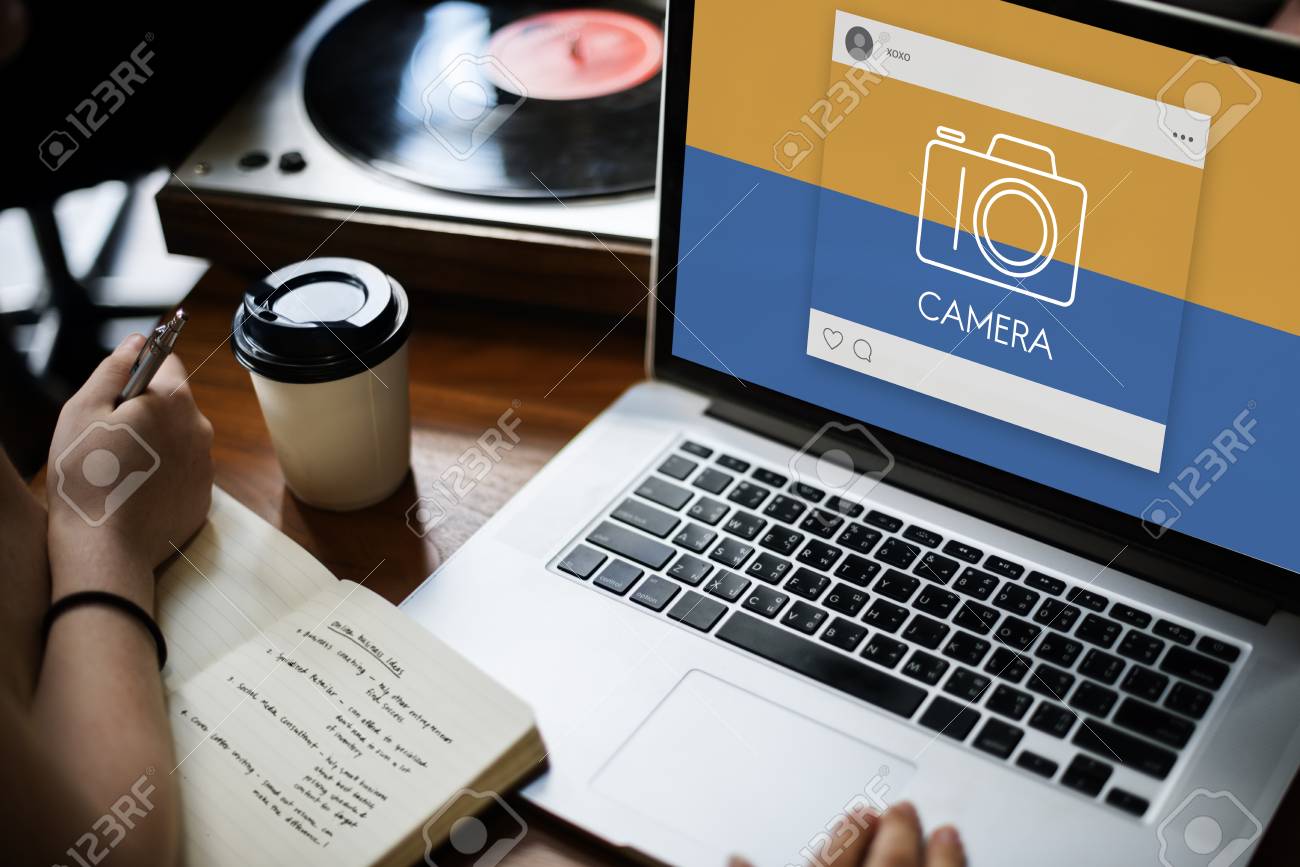 Gente Que Usa La Computadora Trabajando Con El Ícono De La Cámara. Fotos, retratos, imágenes y fotografía de archivo libres de derecho. Image 82956378