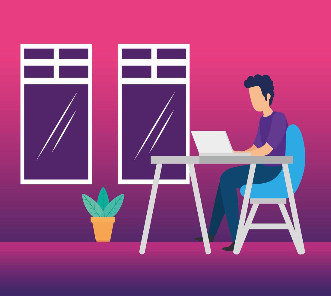 Hombre que trabaja en el lugar de trabajo con computadora e iconos 2700352 Vector en Vecteezy