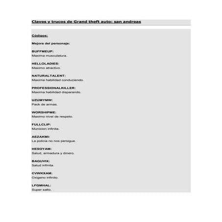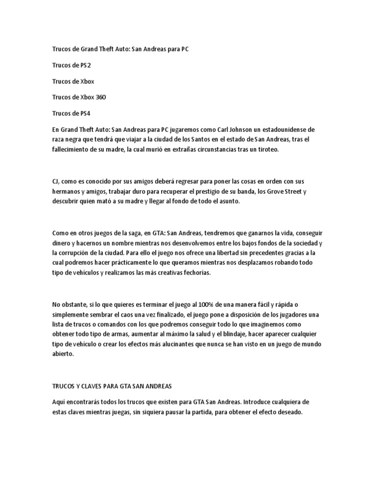 Trucos GTA San Andreas - PC. TODAS Las Claves y Códigos (2019) | PDF | Ocio | Arsenal