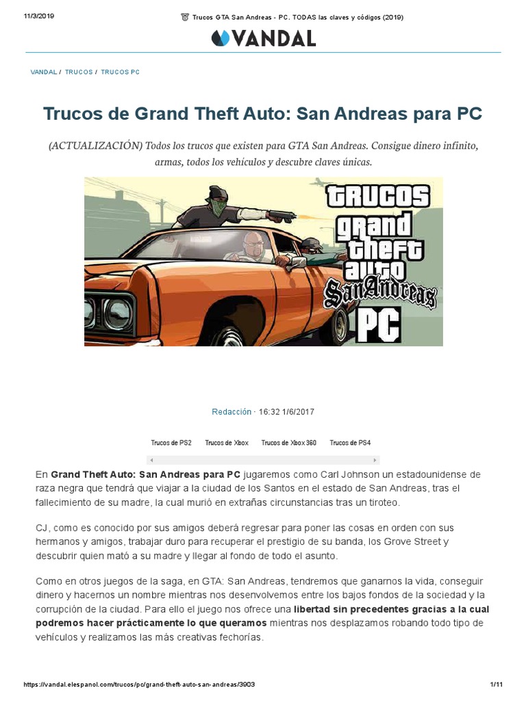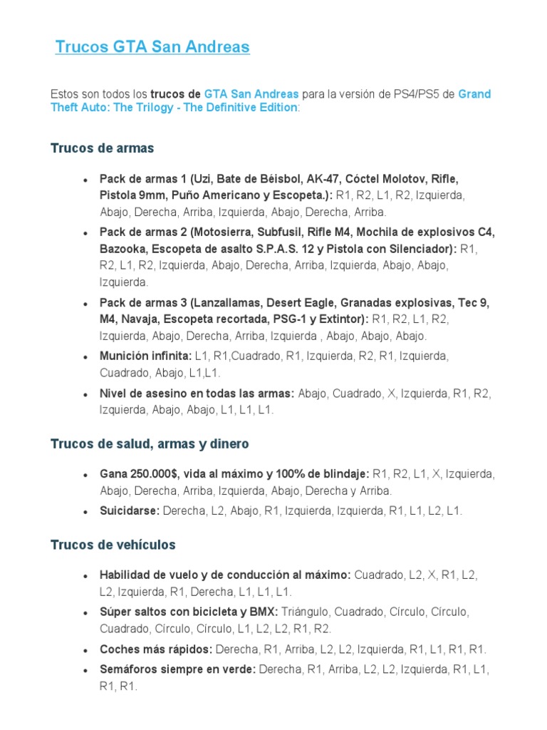 Guía completa de trucos para GTA San Andreas en PS4/PS5 | PDF