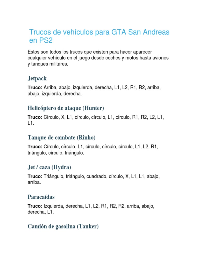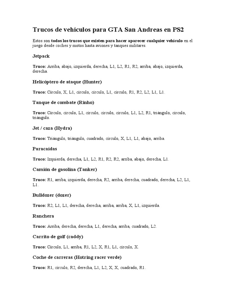 Trucos de Vehículos para GTA San Andreas en PS2 | PDF
