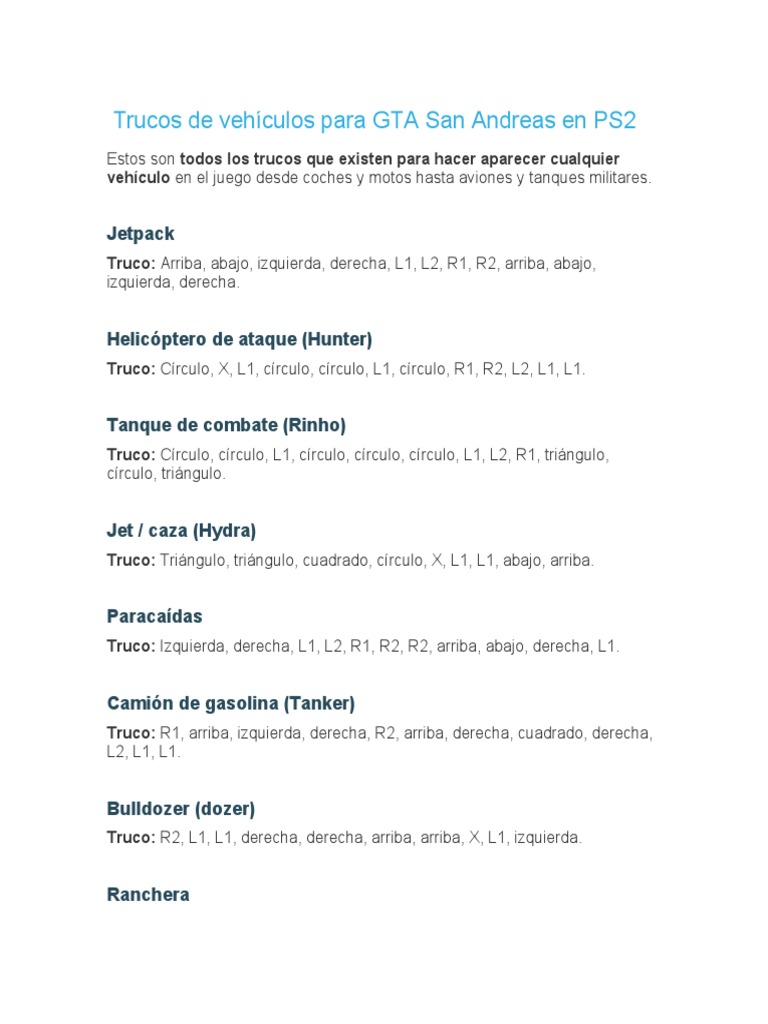 Trucos de Vehículos para GTA San Andreas en PS2 | PDF | Ocio