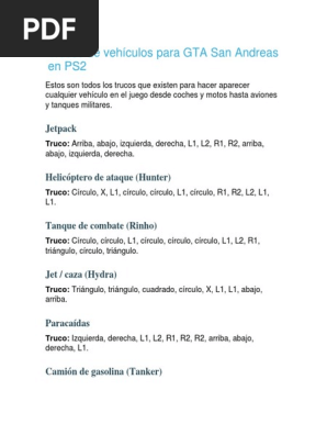 Trucos de Vehículos para GTA San Andreas en PS2 | PDF | Aviación | Vehículos