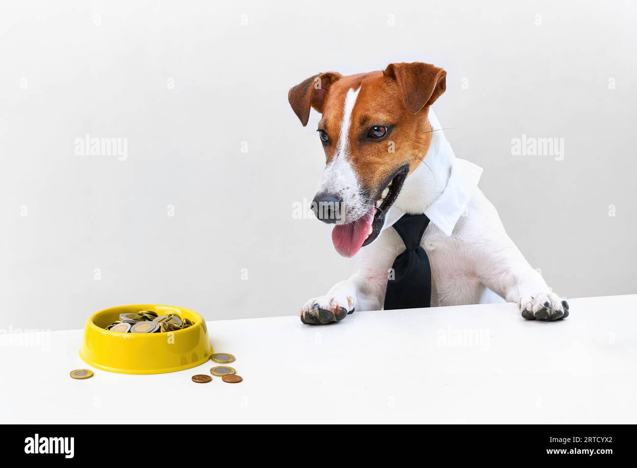 Un perro Jack Russell Terrier con corbata mira su tazón de comida lleno de dinero. La comida para perros se ha vuelto cara Fotografía de stock - Alamy